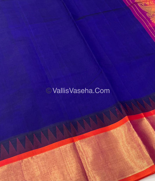 Pure Korvai Silk Cotton Saree - Blue With Peach Shade Temple border - VVKSC001