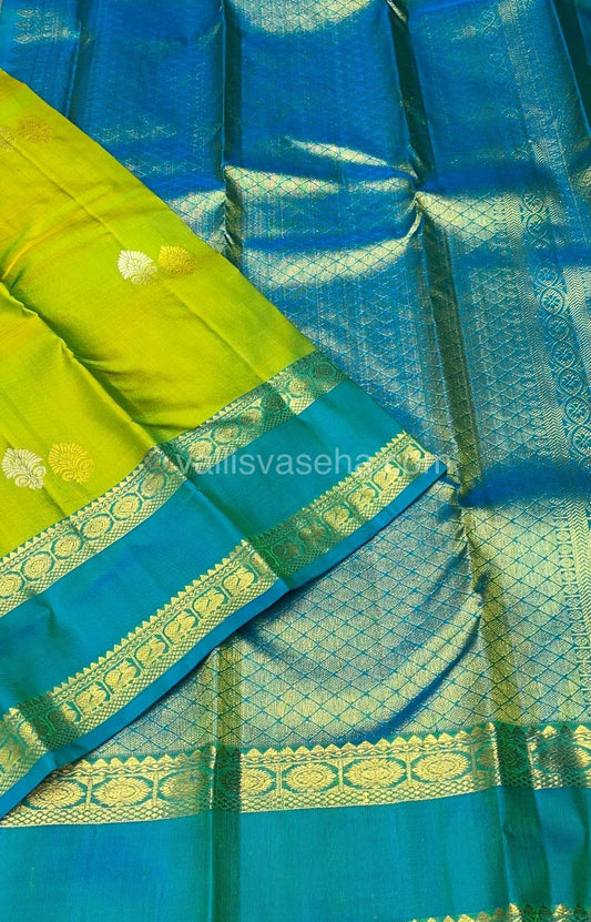 Pure Kanchipuram Silk Saree - Lovely Apple Green (Lemon Green) with Blue - Retta Petta Border - VVPS008