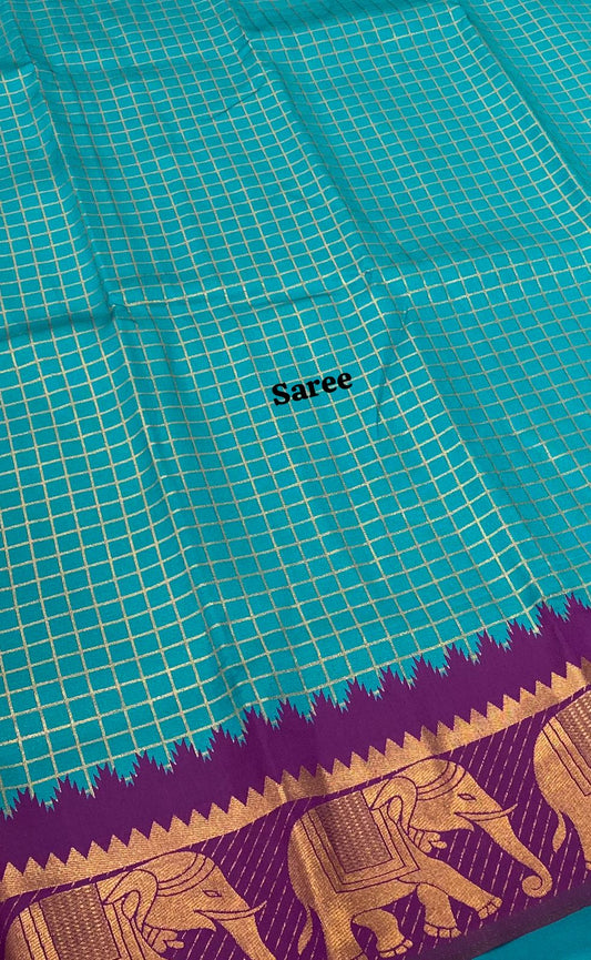 Semi Silk Saree - Kanchi Silk Style - Elephant Border - Ramar Blue with Purple - VVSSS005