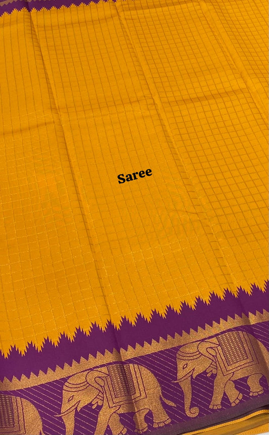 Semi Silk Saree - Kanchi Silk Style - Elephant Border - Dark Yellow with Purple - VVSSS005
