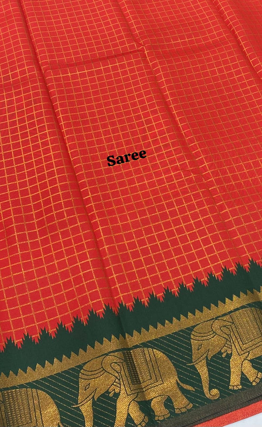 Semi Silk Saree - Kanchi Silk Style - Elephant Border - Red with Green - VVSSS005
