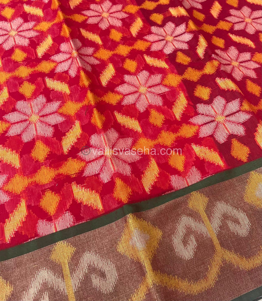 Banarasi Pochampally Weaving Semi Soft Cotton Saree - Pinkish Red with Green - VVBPS001