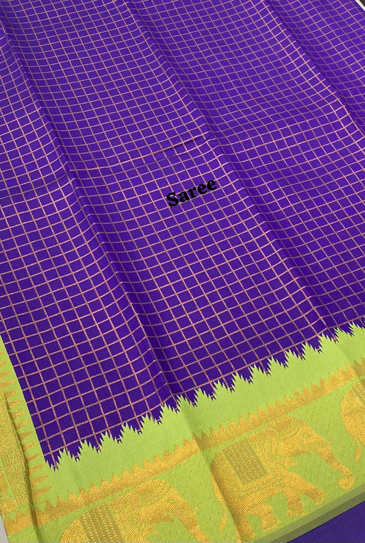 Semi Silk Saree - Kanchi Silk Style - Elephant Border - Violetish Blue with Light Green - VVSSS005