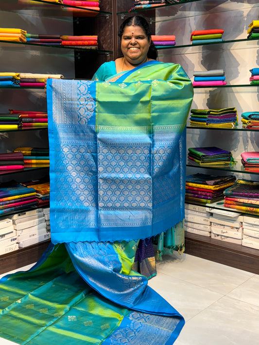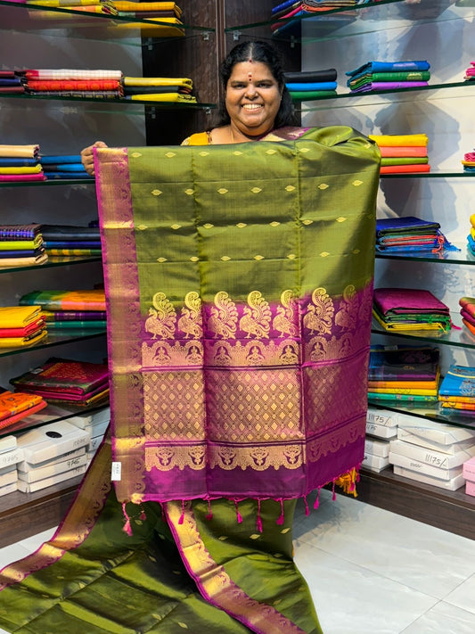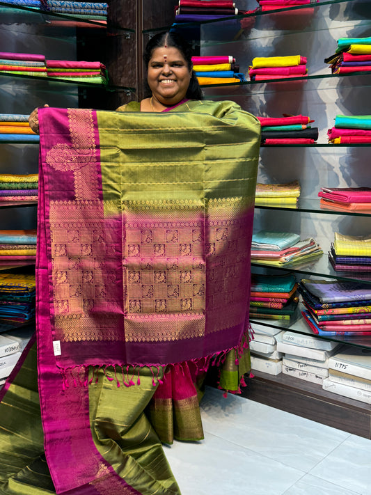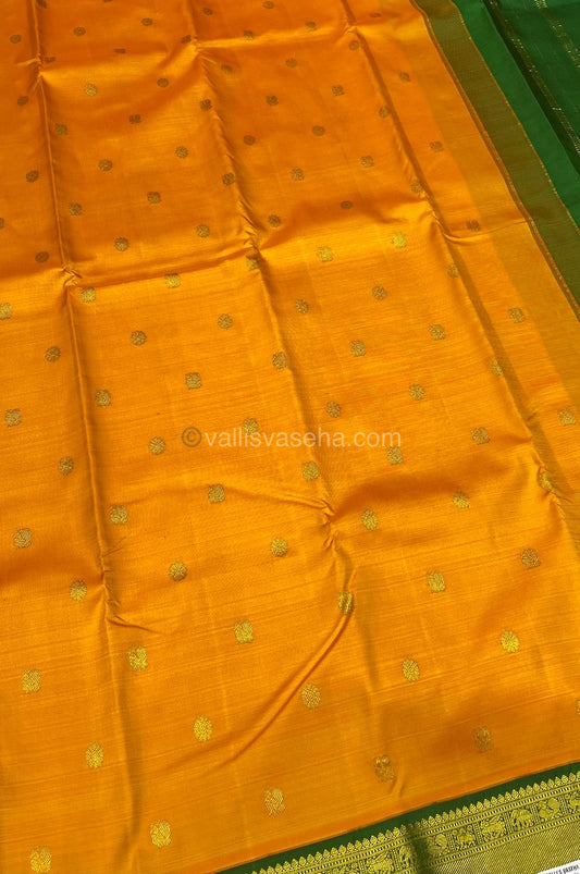 Pure Kanchipuram Silk Saree - Korvai - Mayil & Chakkaram Design - Mambalam Yellow with Green Combo- VVPS004