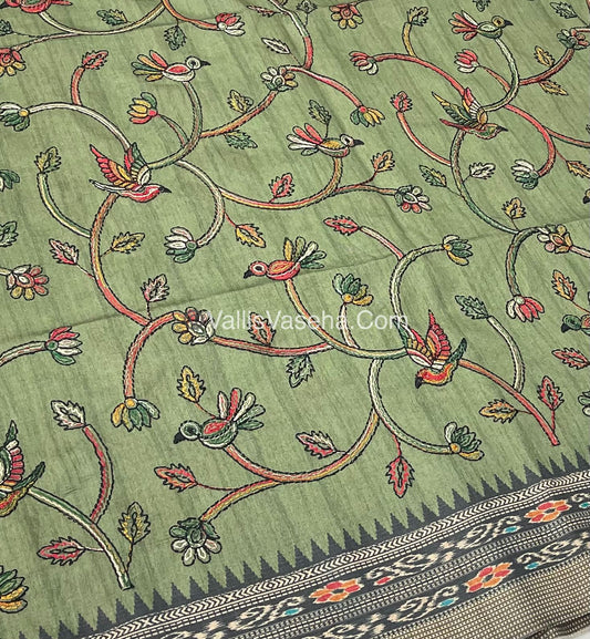 Semi Soft Silk - Tree With Double Birds Butta Border - Green Shade -VVSSS011