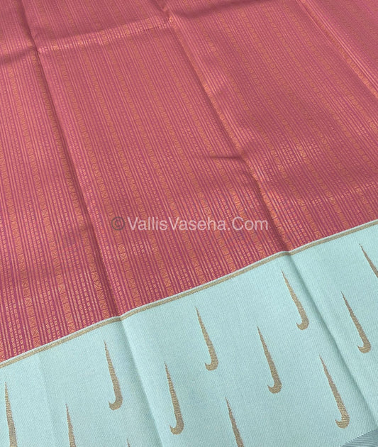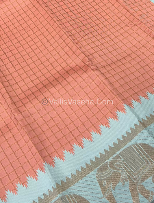 Semi Silk Saree - Kanchi Silk Style - Elephant Border - Light Peach with Light Blue - VVSSS005