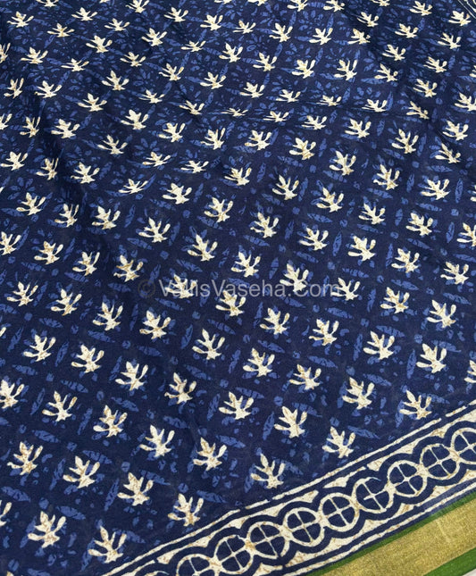 Semi Maheshwari Mixed Cotton Saree - Linen Feel - Indigo Blue & Green - VVMSC003