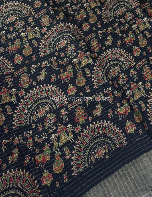 Light Weight Fancy Mixed Kota Cotton - Varli Design Printed Saree - Black Shade - VVKPC001