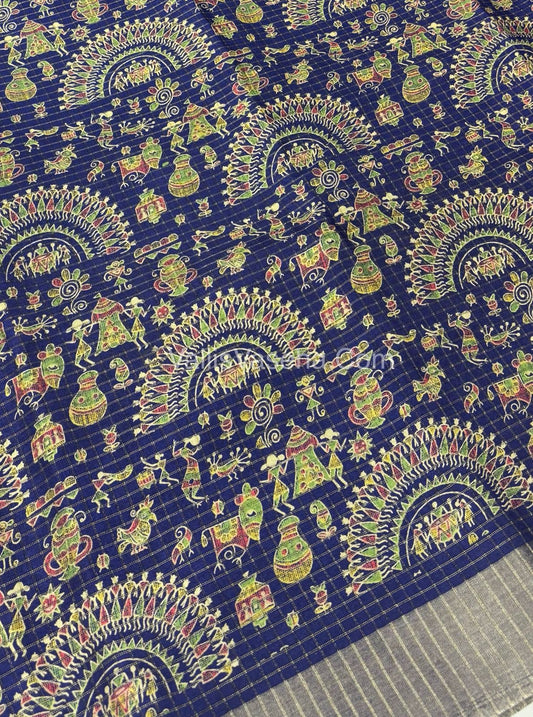 Light Weight Fancy Mixed Kota Cotton - Varli Design Printed Saree - violet Blue Shade - VVKPC001