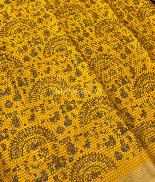 Light Weight Fancy Mixed Kota Cotton - Varli Design Printed Saree - Yellow Shade - VVKPC001