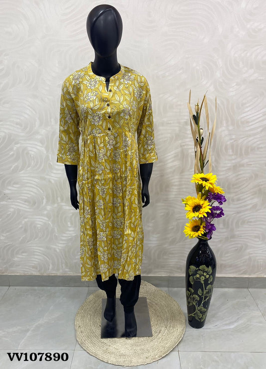 Umbrella Slub Cotton Printed Kurti - Yellow Shade - VV107890