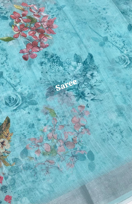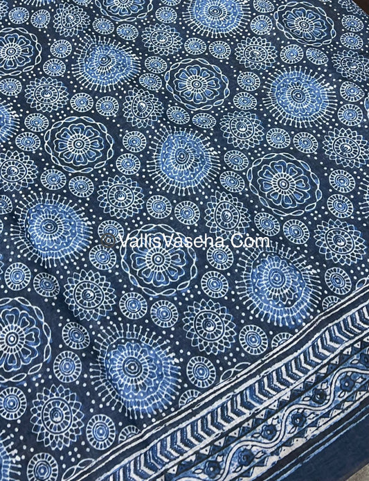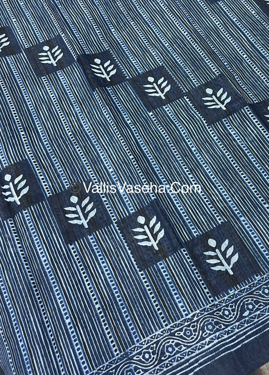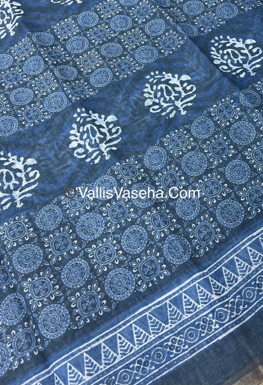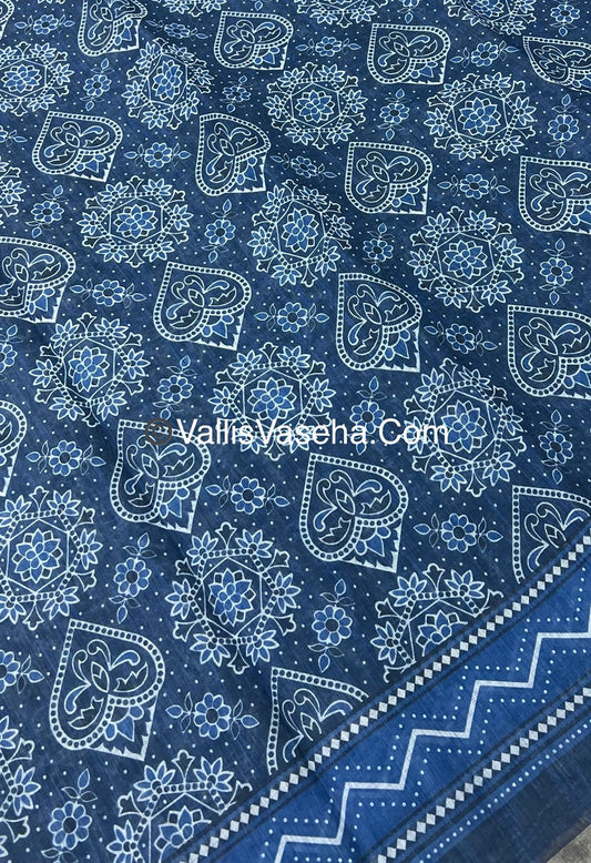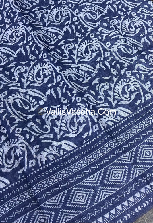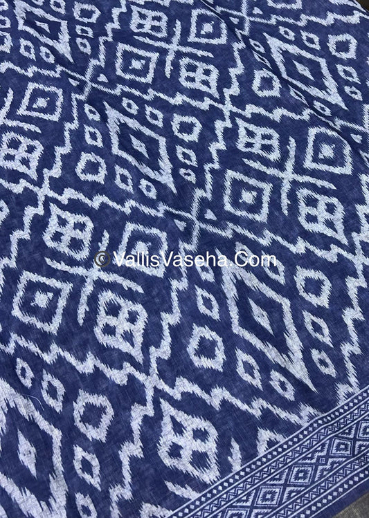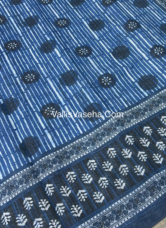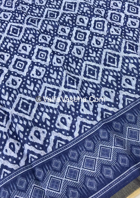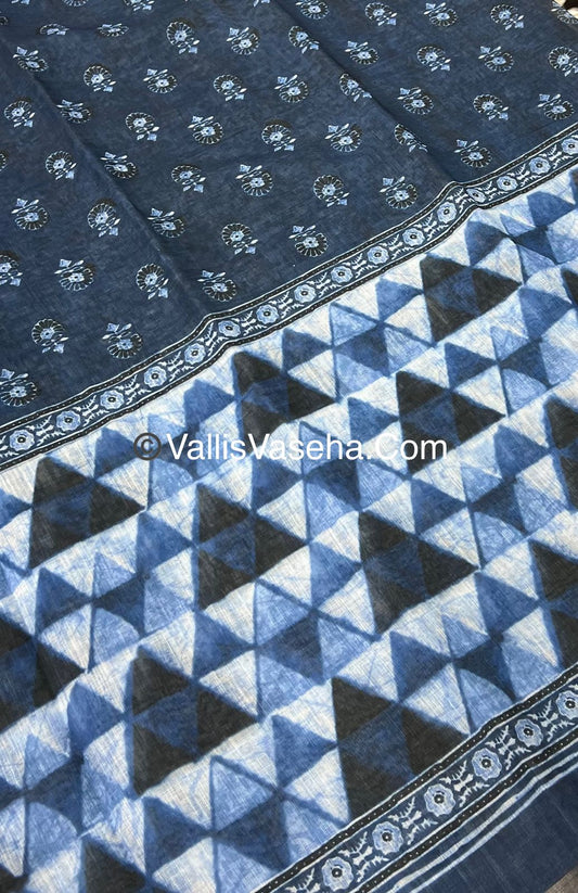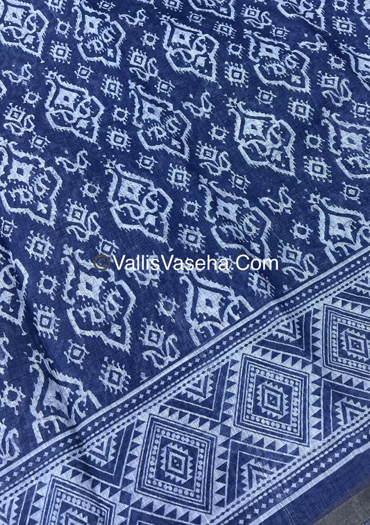 Linen Mixed Cotton Saree - Indigo Blue - Printed - VVLMP001
