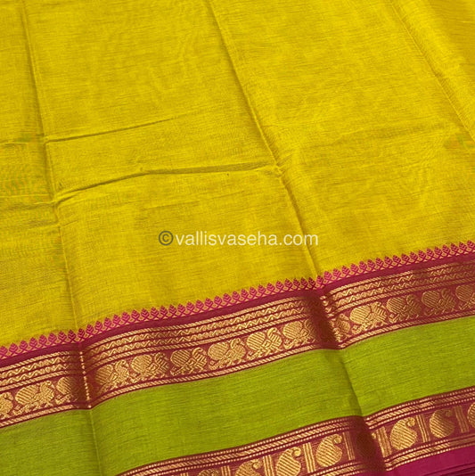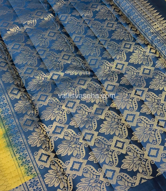 Semi Silk Saree - Kanchi Silk Style - Elephant Border - Yellow with Blue - VVSSS005
