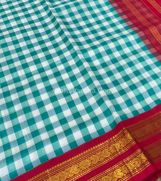 Pure Korvai Silk Cotton - Checks Pattern - Red with Green Shade - VVKSC015