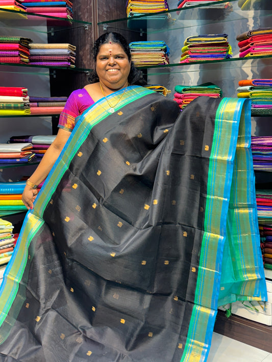 Pure Korvai Silk Cotton Saree - Black with Teal Greenish Blue Combo - VVKSC004