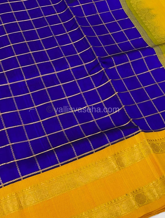 Pure Korvai Silk Cotton With Retta Petta Border - Checks pattern - Yellow & Blue - VVKSC013