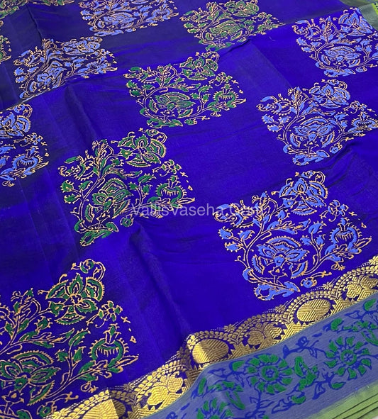 Pure Printed Silk Cotton Sarees - Blue with Green - VVPSC003