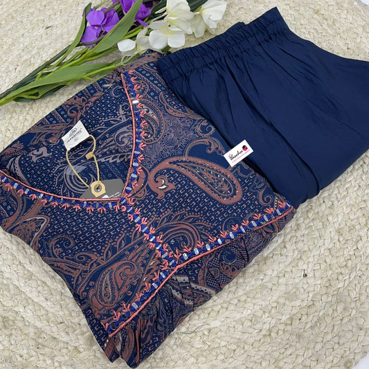 Salwar & Kameez(2pc) Set - Indigo Blue kurti & Khadi Cotton Bottom with Appliqué work- VV107886 & VV107887 - VVCOD001