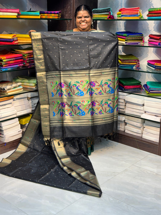 Semi Raw Silk - Paithani Design Weaving - Black Shade - VVRS005