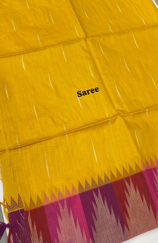 Banarasi Pochampally Weaving Semi Soft Cotton Saree - Yellow with Navy Blue - VVBPS001