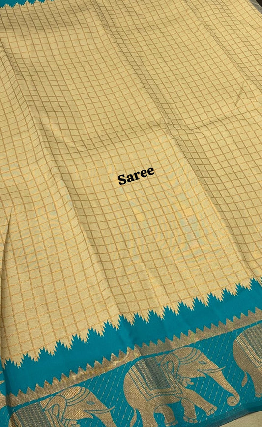 Semi Silk Saree - Kanchi Silk Style - Elephant Border - Cream ( Chikku) with Ramar Bluish Green - VVSSS005