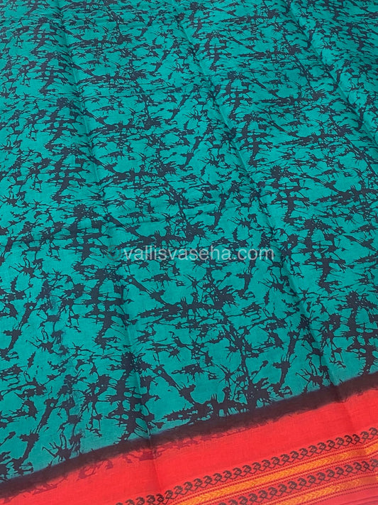Sungudi Cotton Saree | Cloud Print - Peacock Green with Peachish Red Shade - VVSCV004