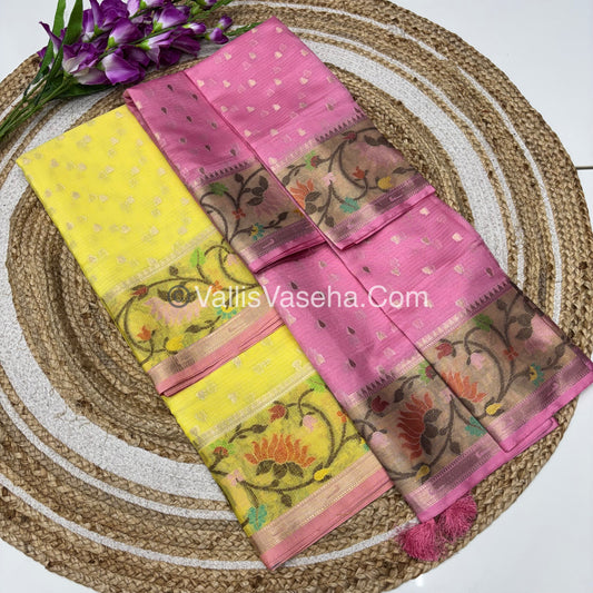 Unstitched - Lehenga Material - Zari Kota Tissue - Yellow & Pink - VVULM001