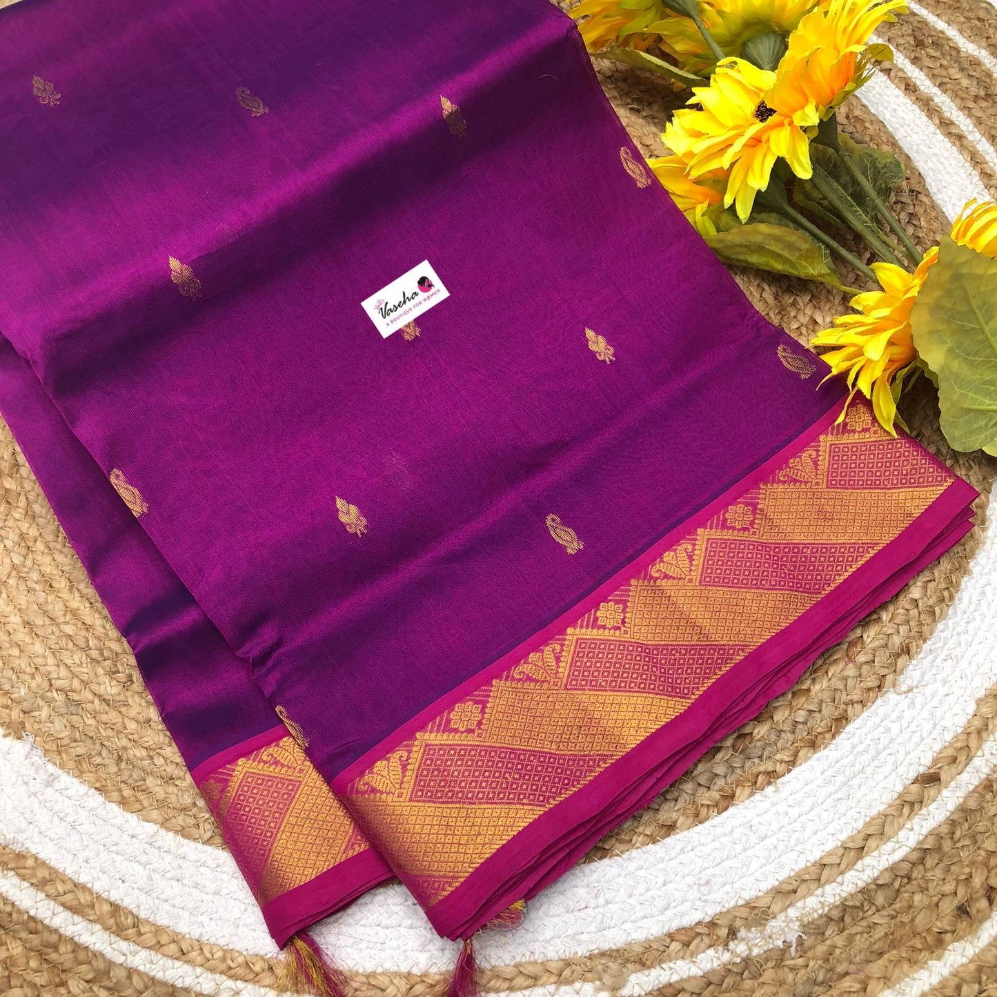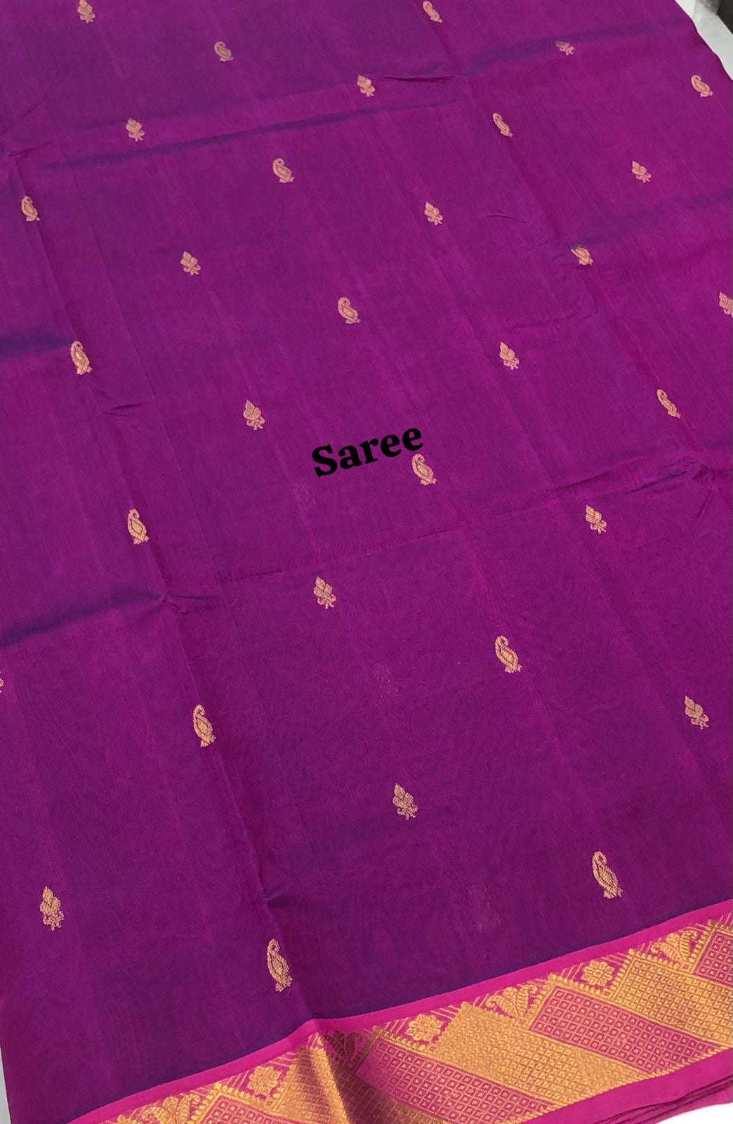 10 yards - Pure Silk Cotton Saree with all over butta and zari woven border . Pure Silk cotton sarees with 60% silk thread and 40% cotton thread , Contrast Grand pallu .