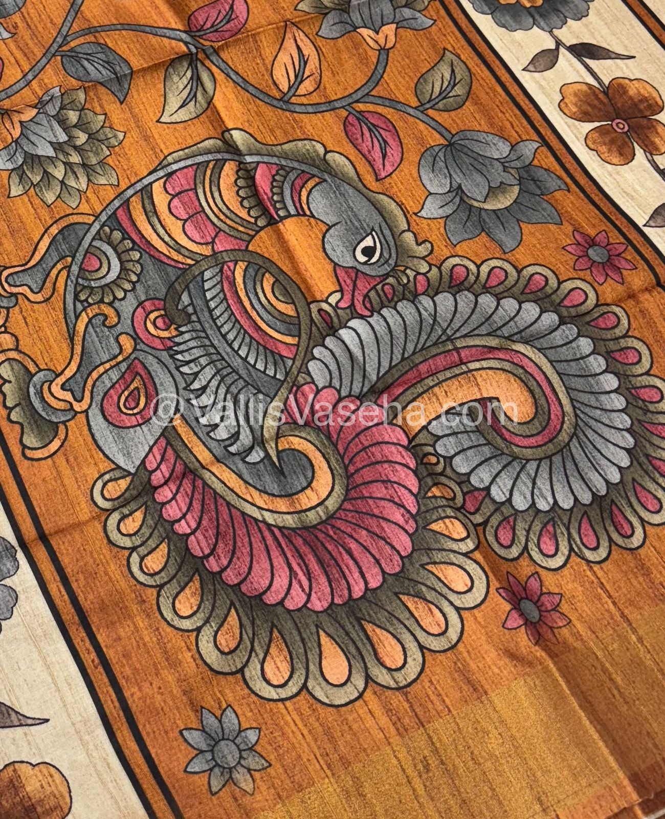 Soft & Smooth flowy Texture - Semi Gicha Tussar Silk Saree with all over Kalamkari Design and Contrast Border . Kalamkari Printed Pallu With Tassels & Kalamkari Printed Blouse .Light weight Saree . Good for Office / Casual Wear