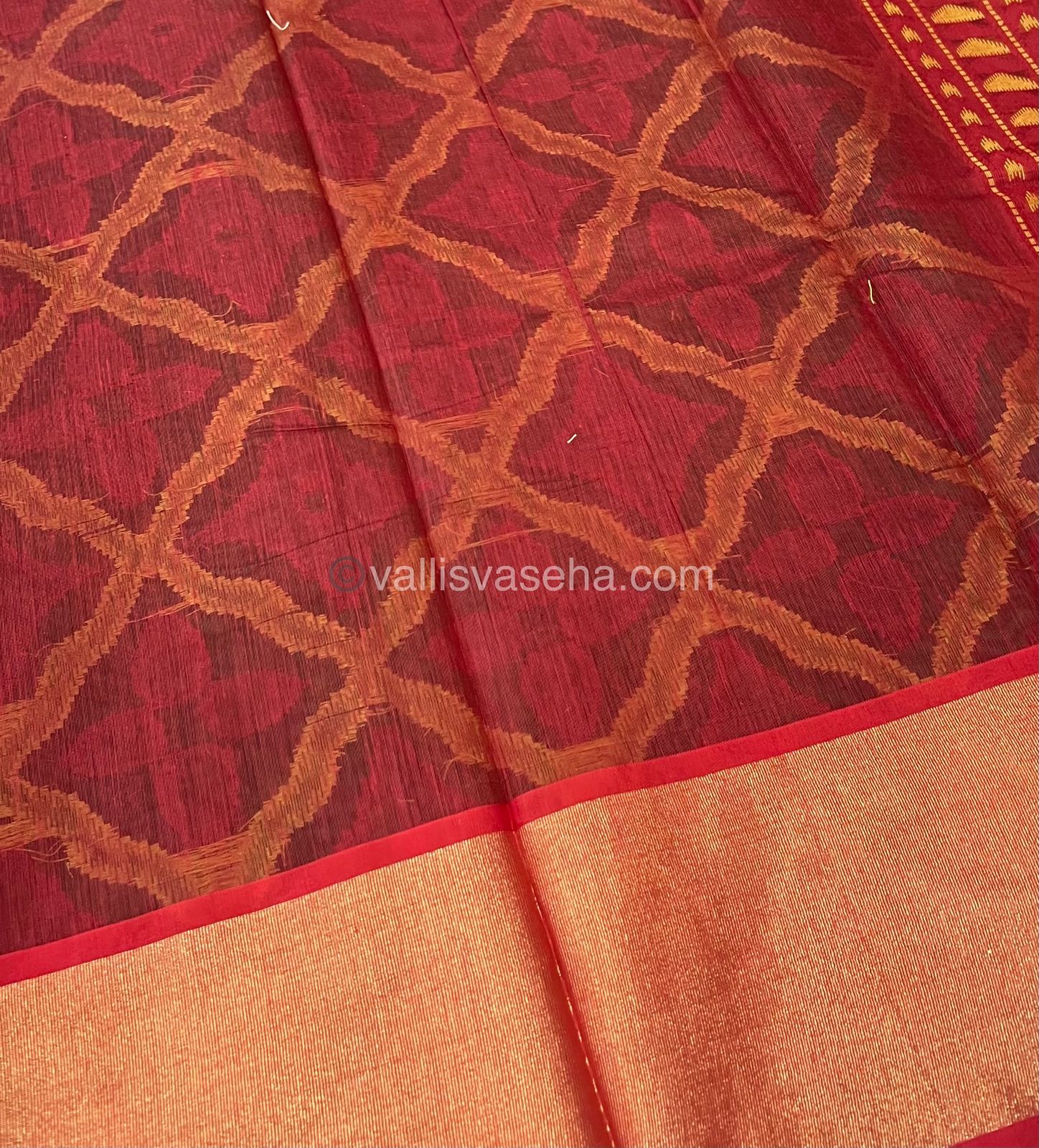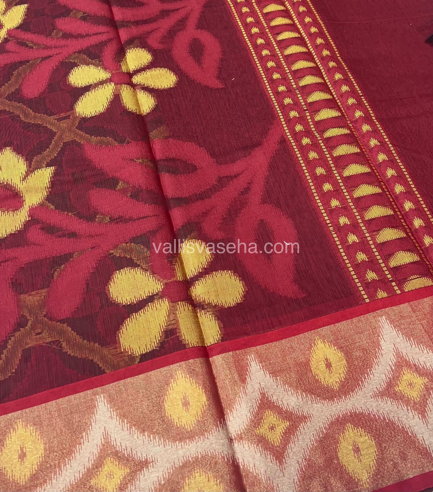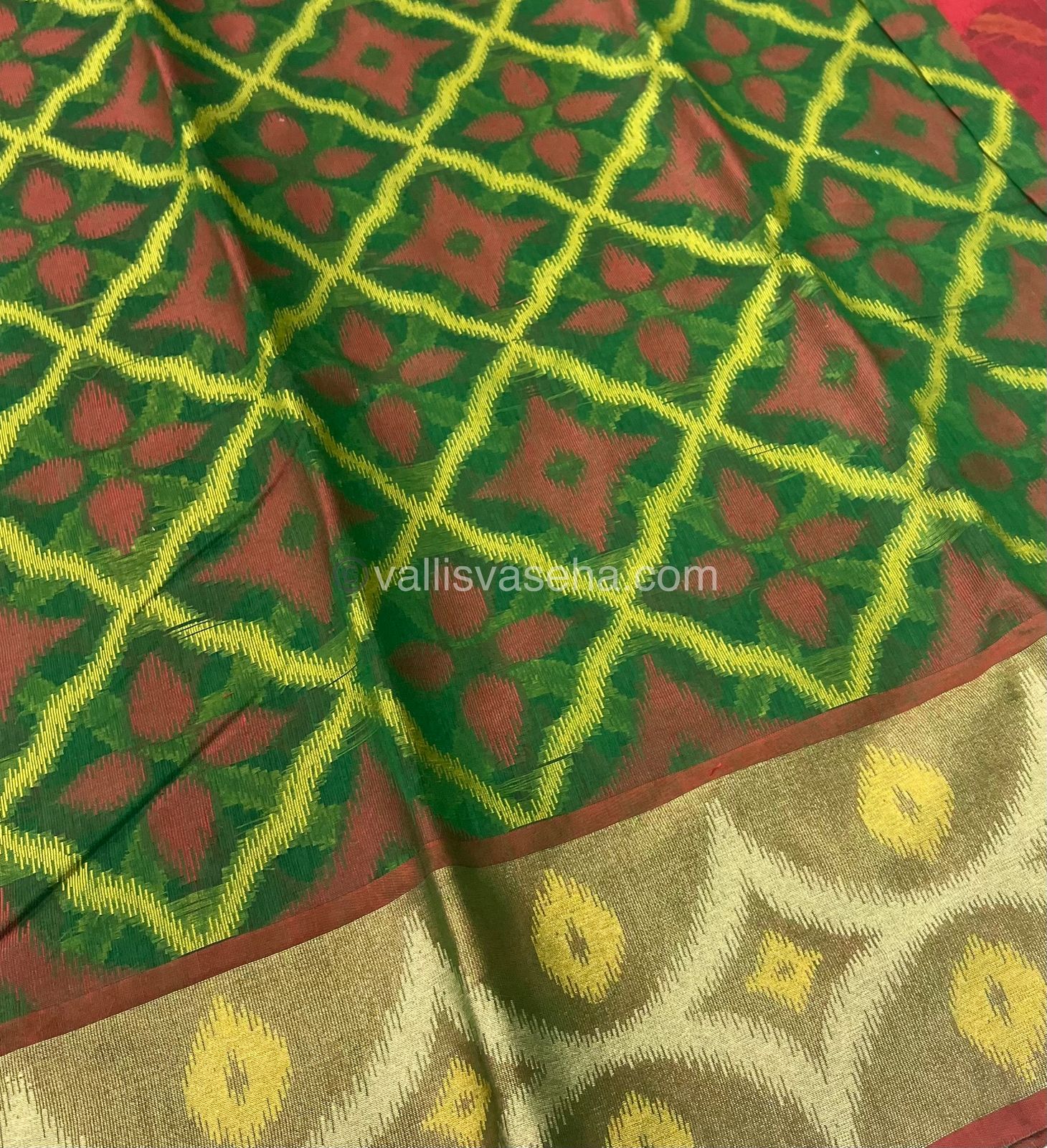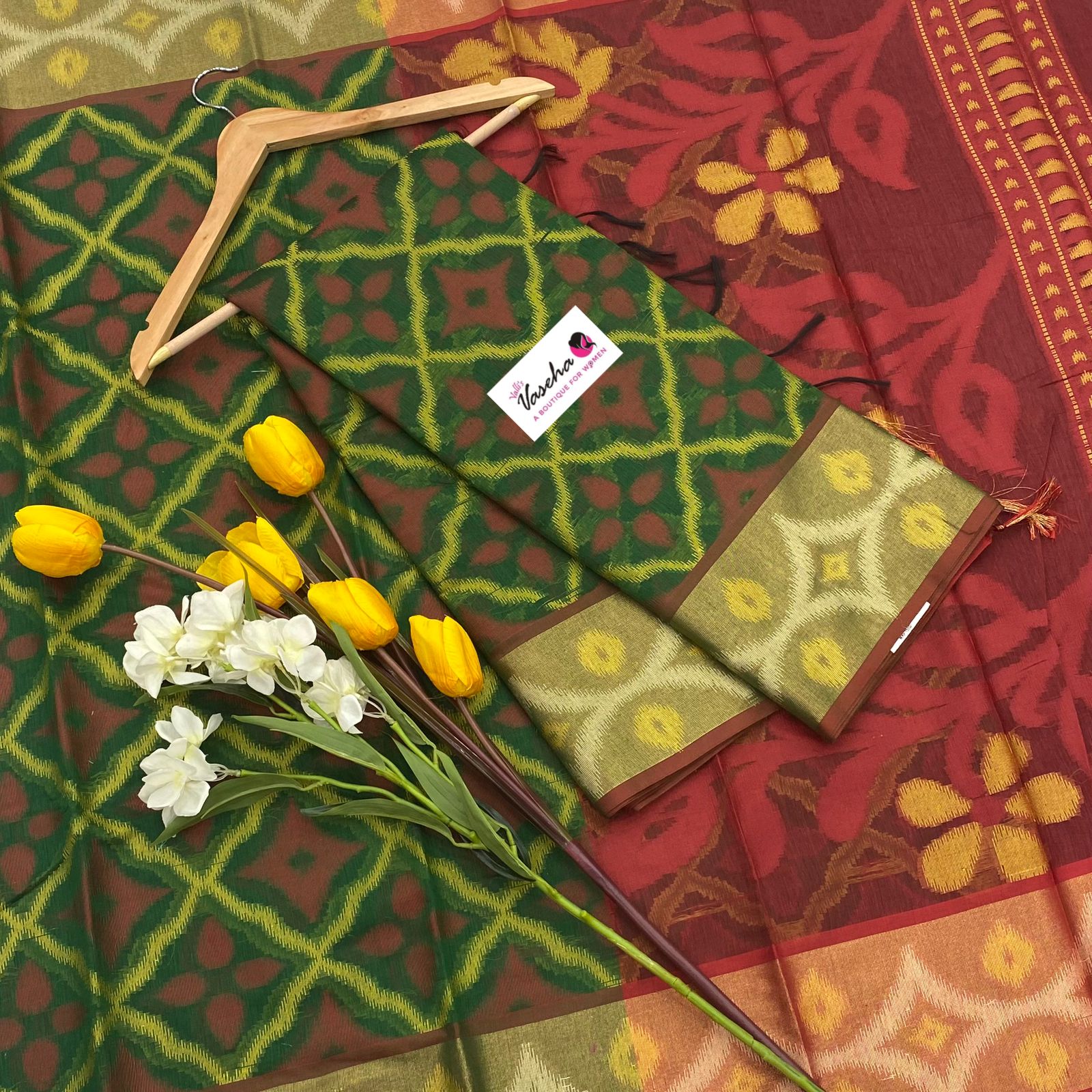 Banarasi Pochampally Weaving Semi Soft Cotton Saree - Green with Merun - VVBPS001