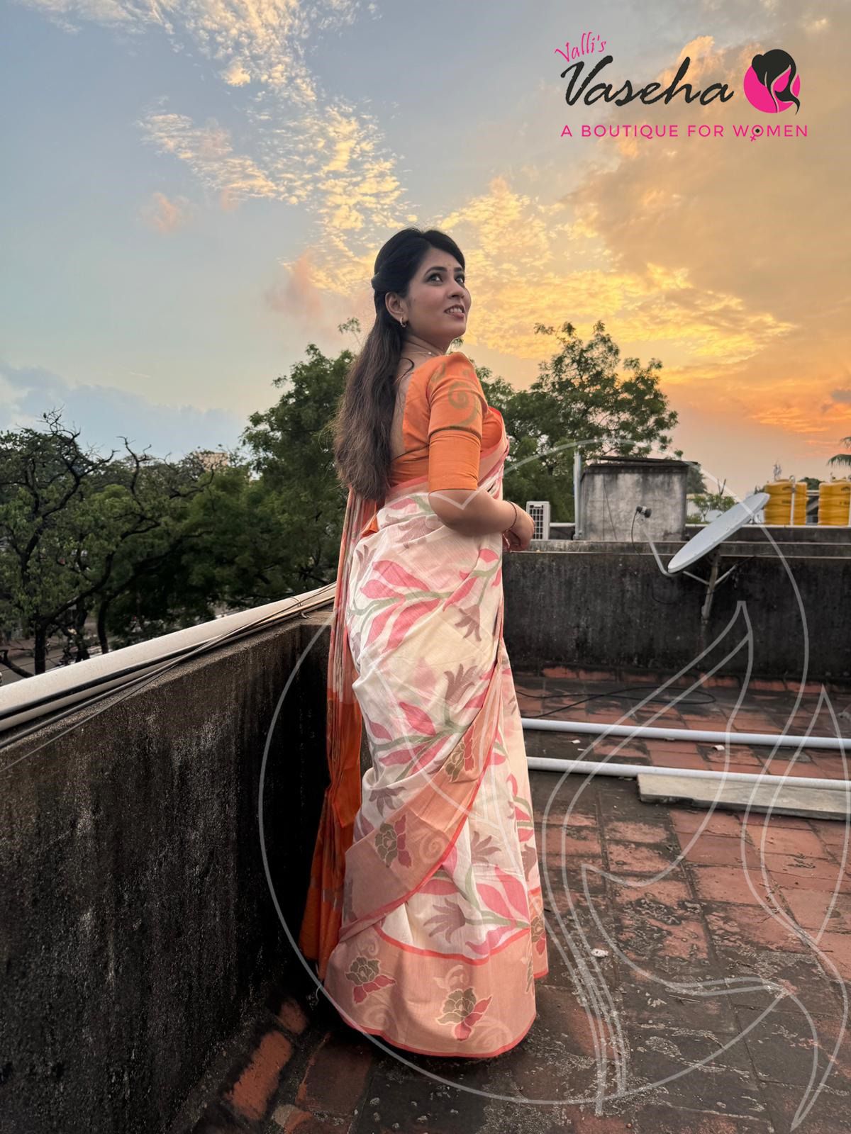 Banarasi Pochampally Weaving Semi Soft Cotton Saree - Cream with Orange - VVBPS001
