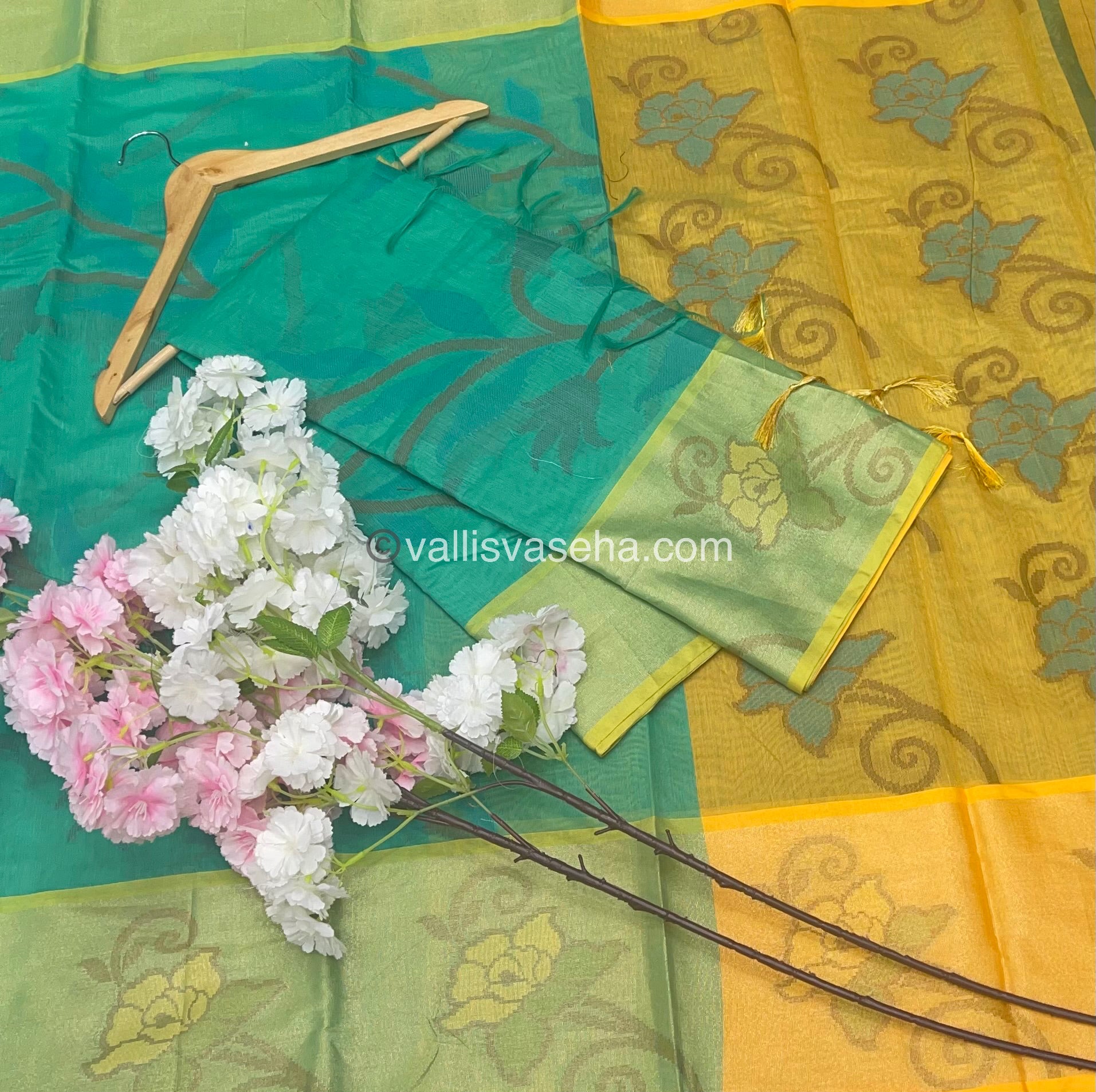 Banarasi Pochampally Weaving Semi Soft Cotton Saree - Green with Yellow - VVBPS001