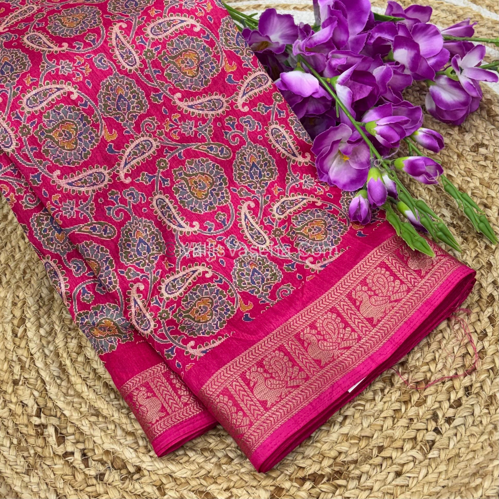 Casual wear . Very soft texture . Fancy Viscose mulberry silk , Beautiful Mango printed design with zari woven mayil butta border, printed Pallu and blouse.