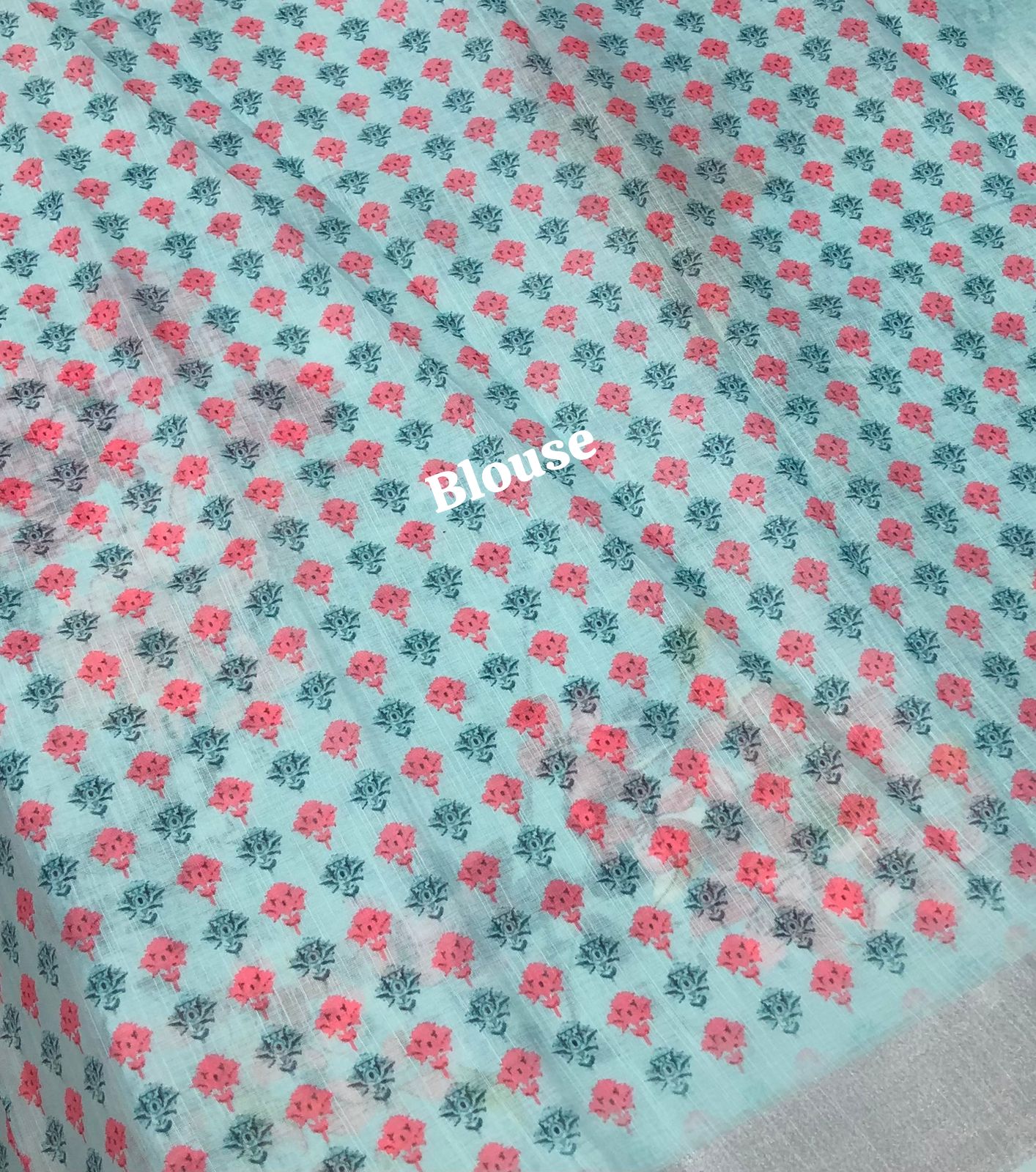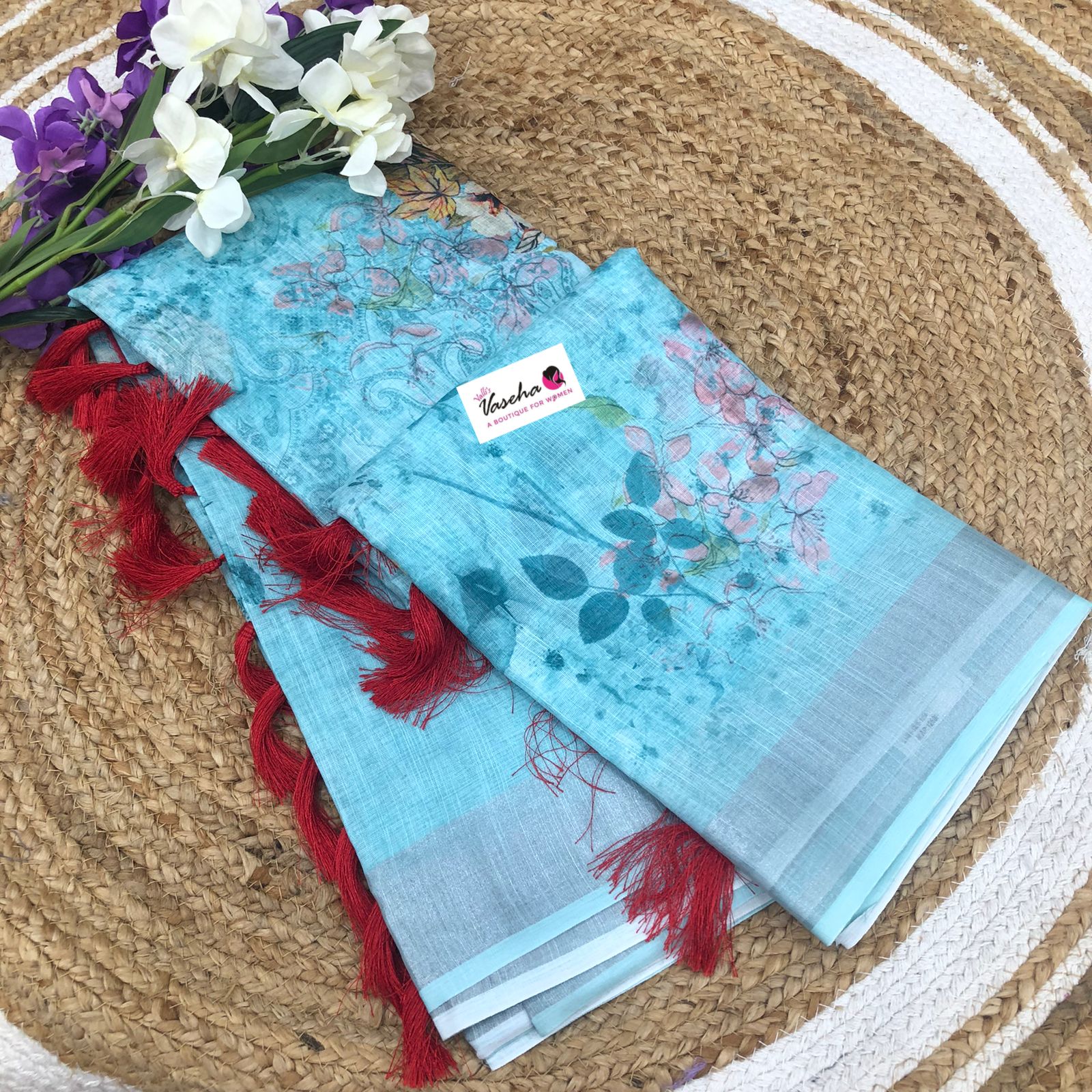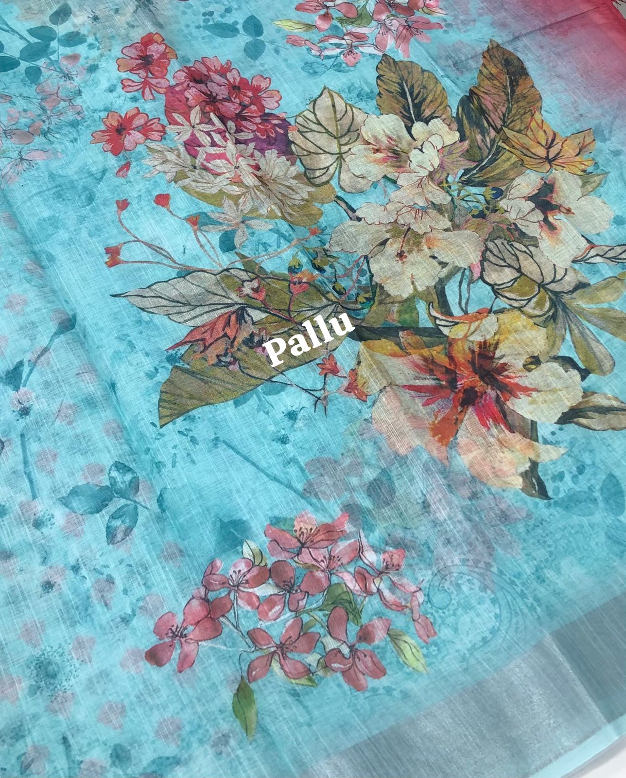 Soft 90 counts linen cotton with floral digital prints and beautiful Jahllar attached to the Pallu With Printed Blouse. Very elegant and special soft finished .