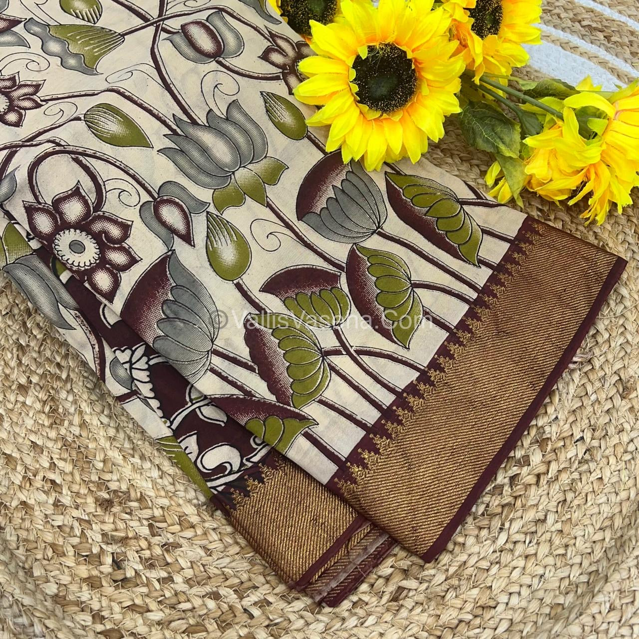Beautiful Chennur Silk Sarees with all over Kalamkari prints and Kalamkari printed Pallu and printed Blouse.Soft and flowly Texture.