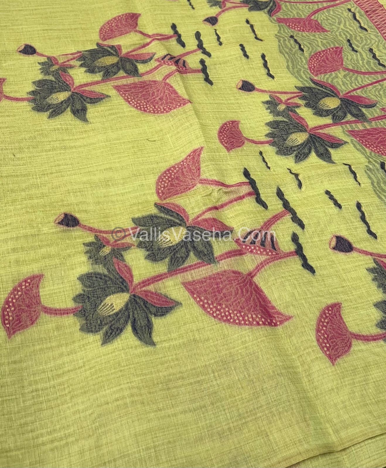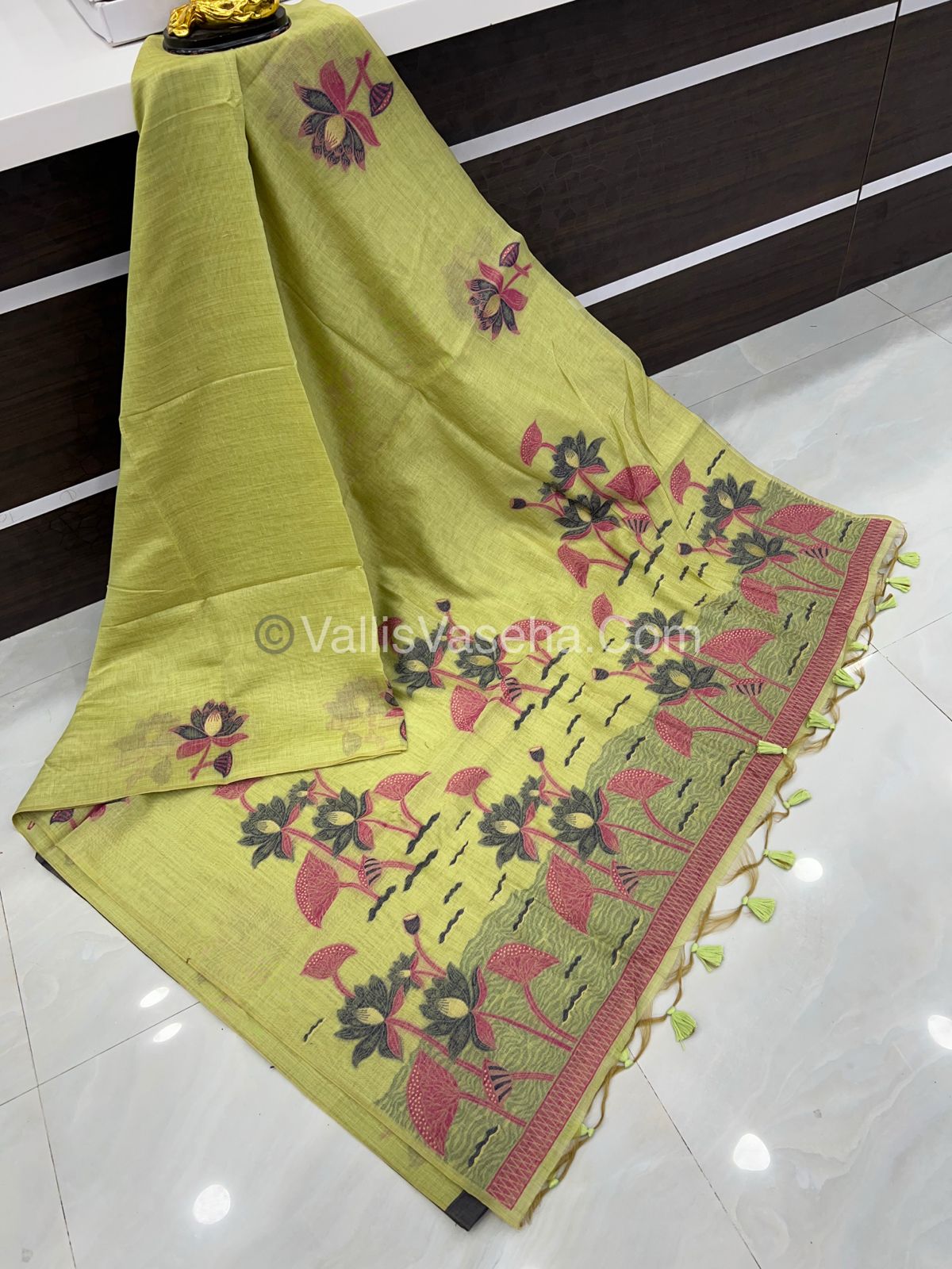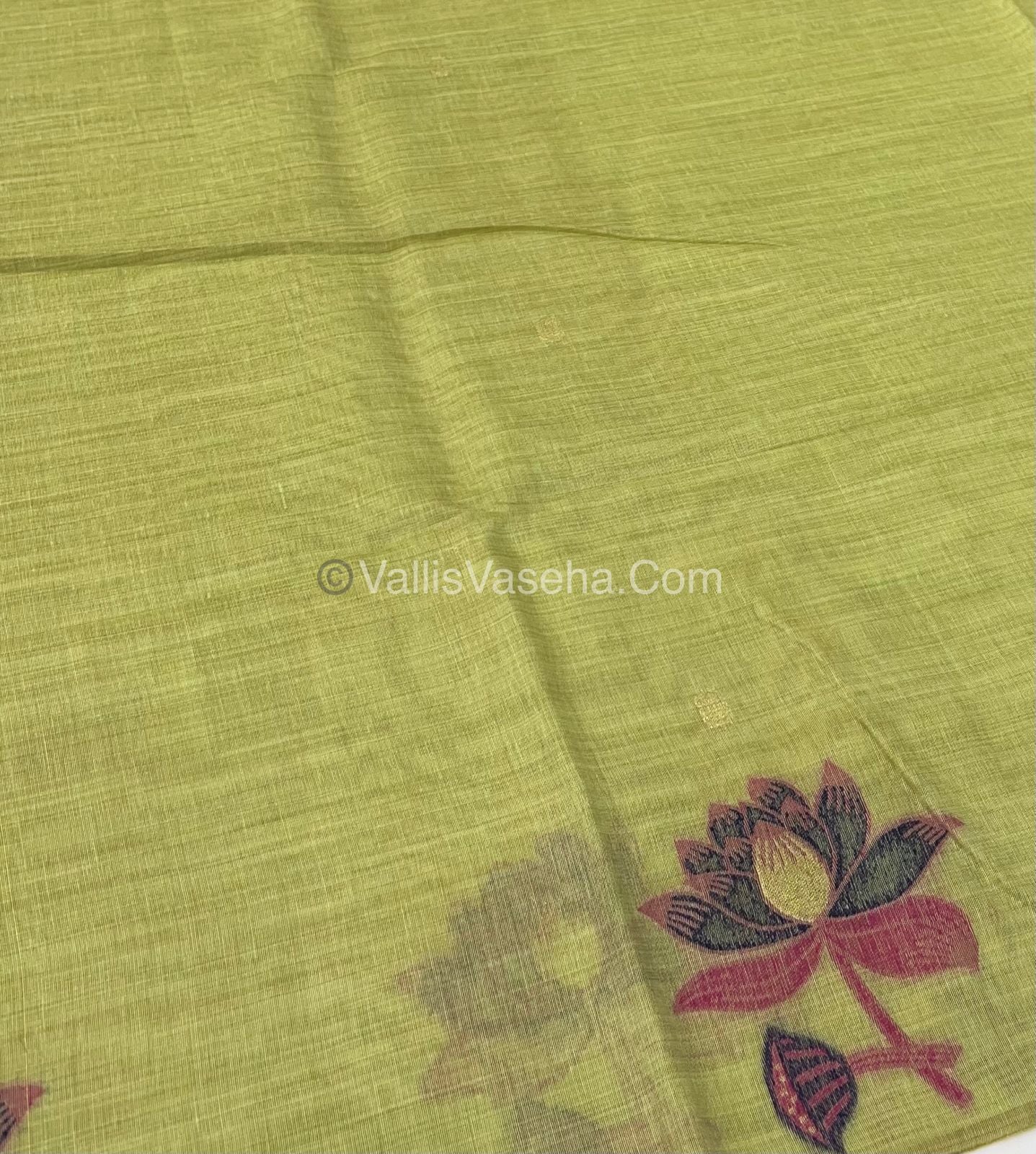 Exclusive Muga Cotton Saree - Lovely Pastel shades - All over the saree beautiful thread/zari embroidery with running pichwai embroidery design in pallu with tassels . Contrast blouse with small Butta and border.