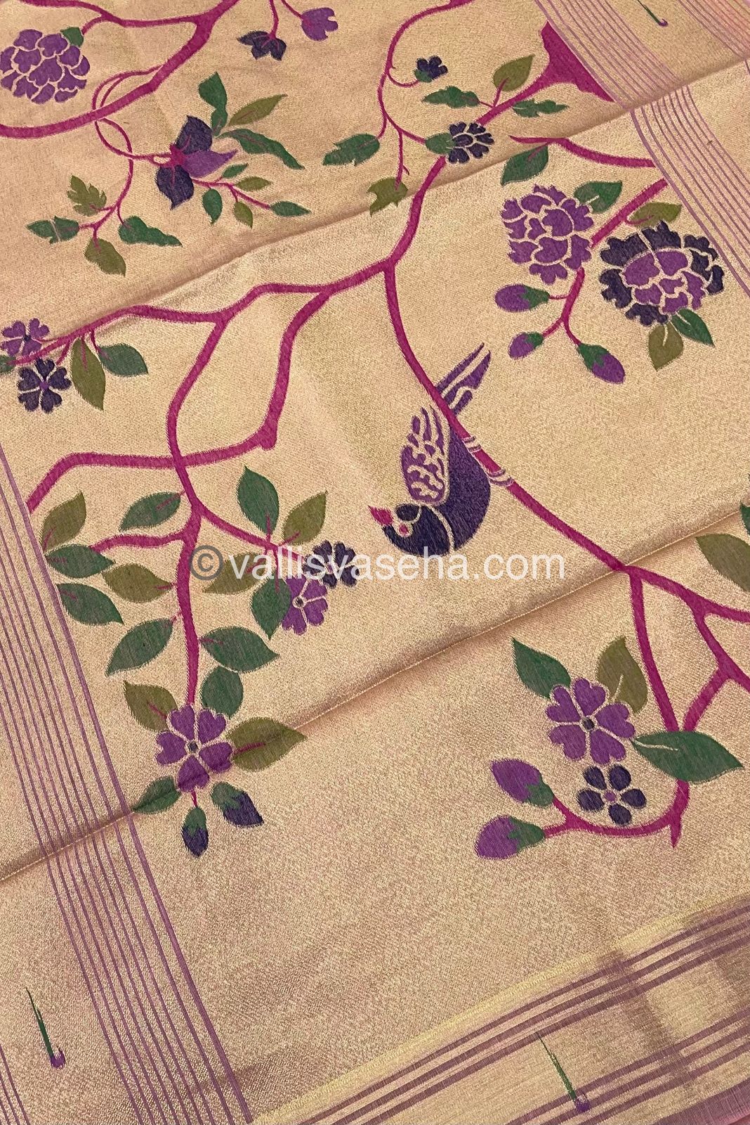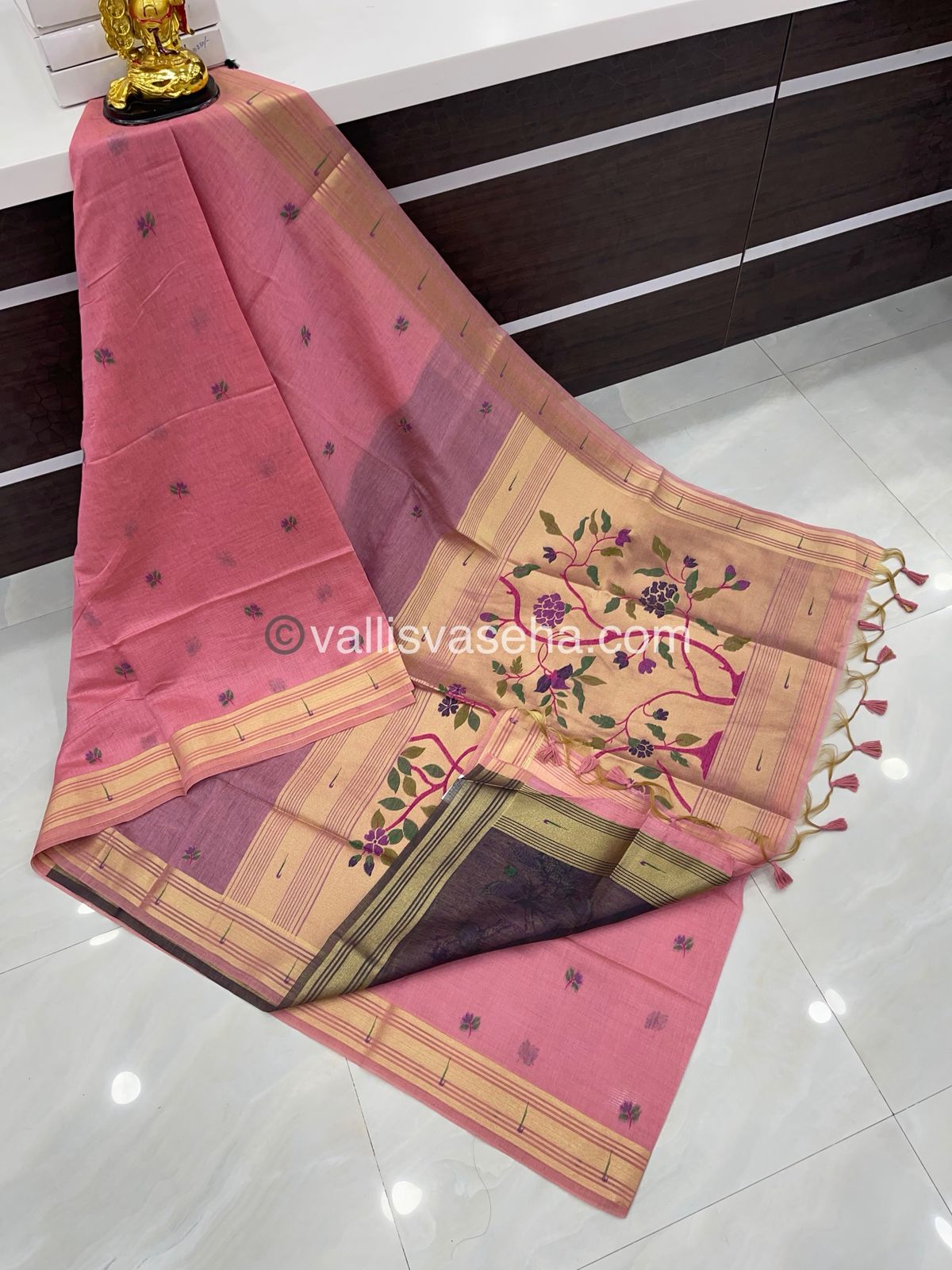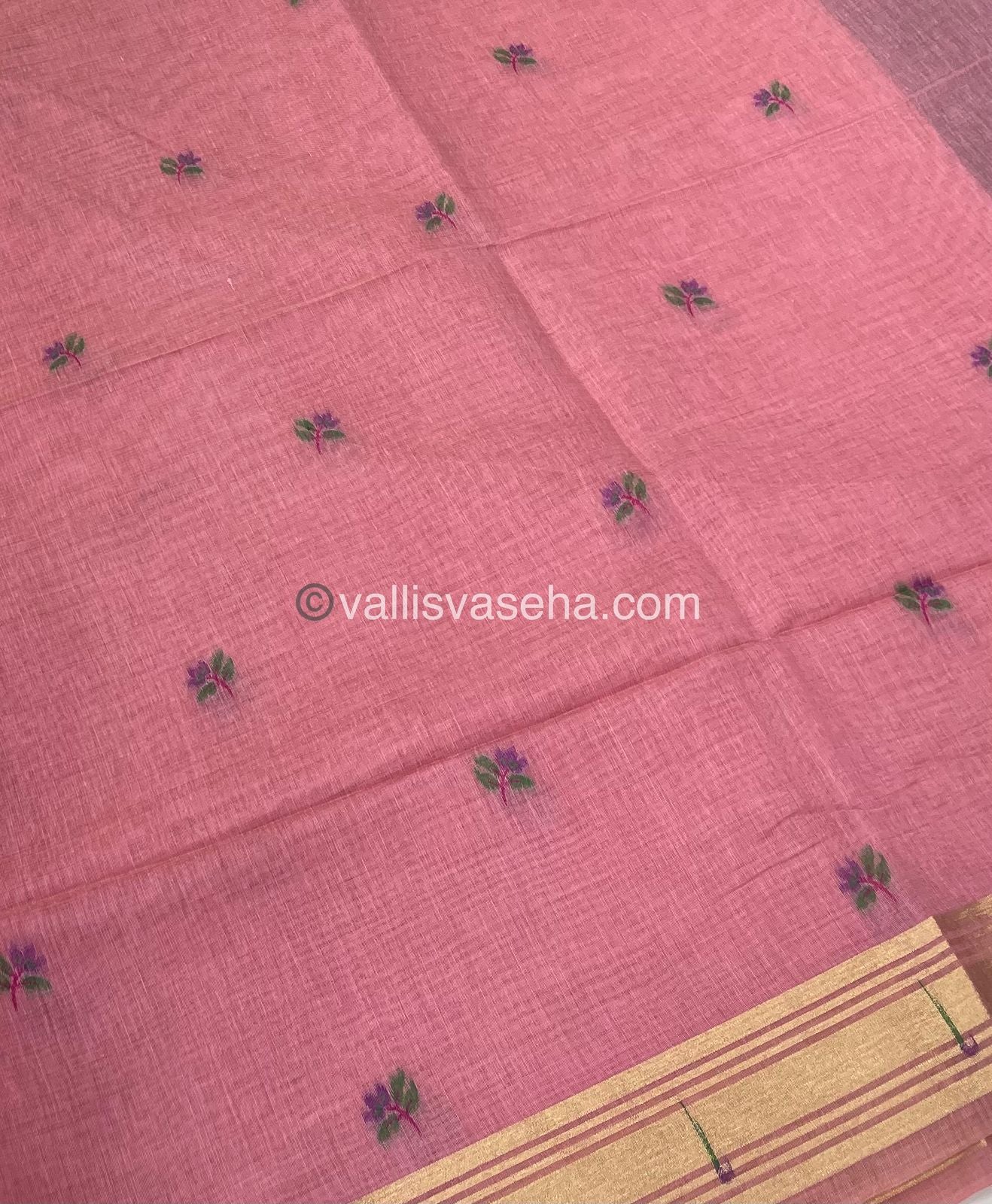Exclusive Muga Cotton Saree - Lovely Pastel shades  - All over the saree beautiful thread embroidery with running embroidery design in pallu with tassels .Same colour blouse with small Butta and border. ( Similar to Jamdhani Design weaving )