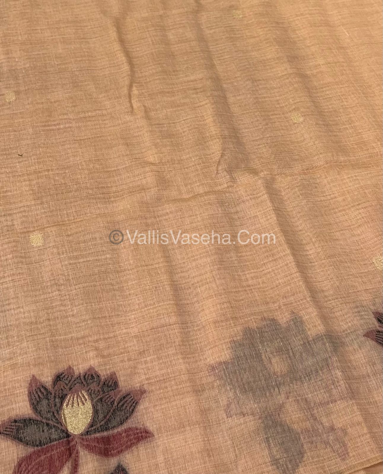 Exclusive Muga Cotton Saree - Lovely Pastel shades - All over the saree beautiful thread/zari embroidery with running pichwai embroidery design in pallu with tassels . Contrast blouse with small Butta and border.