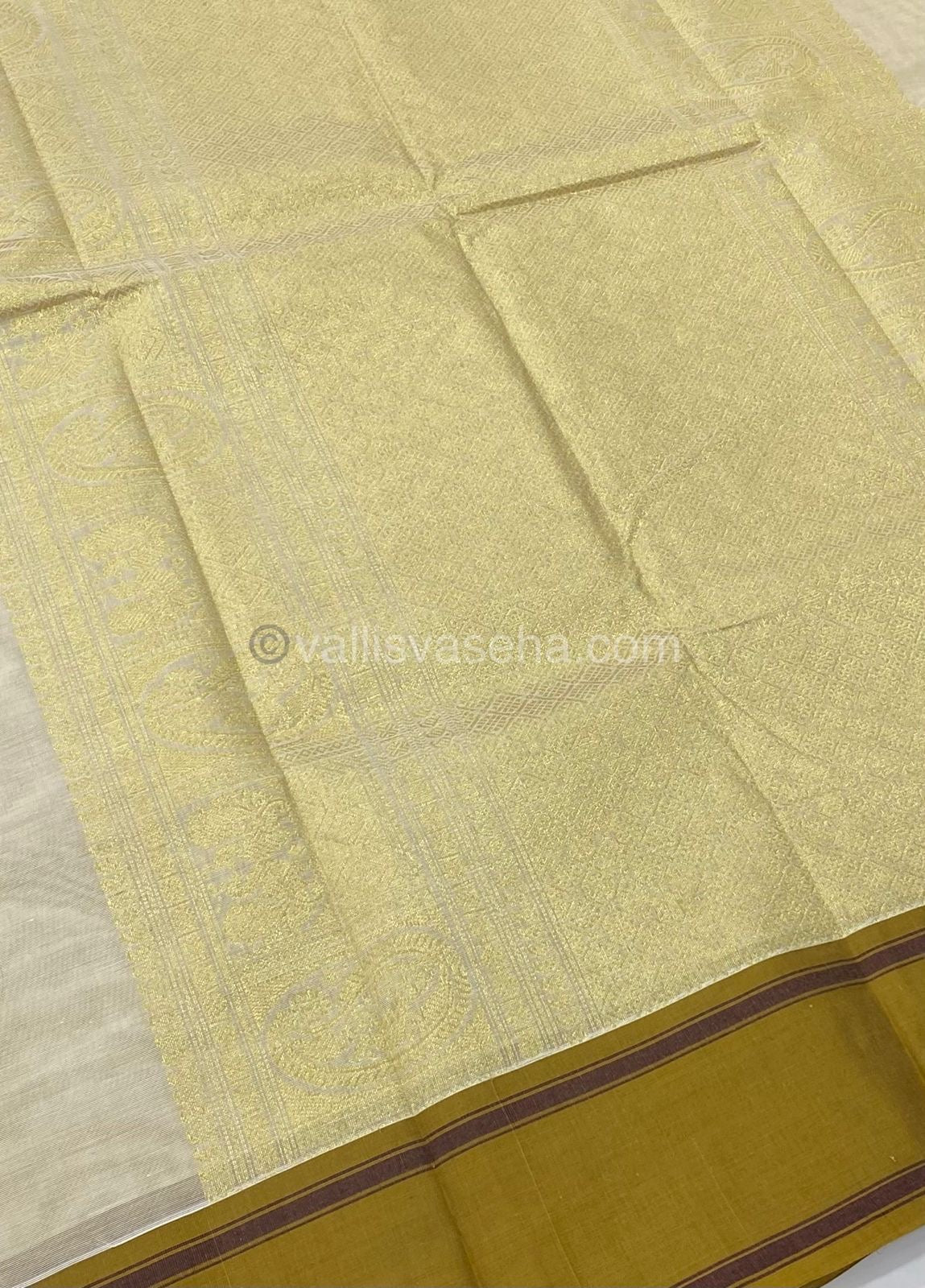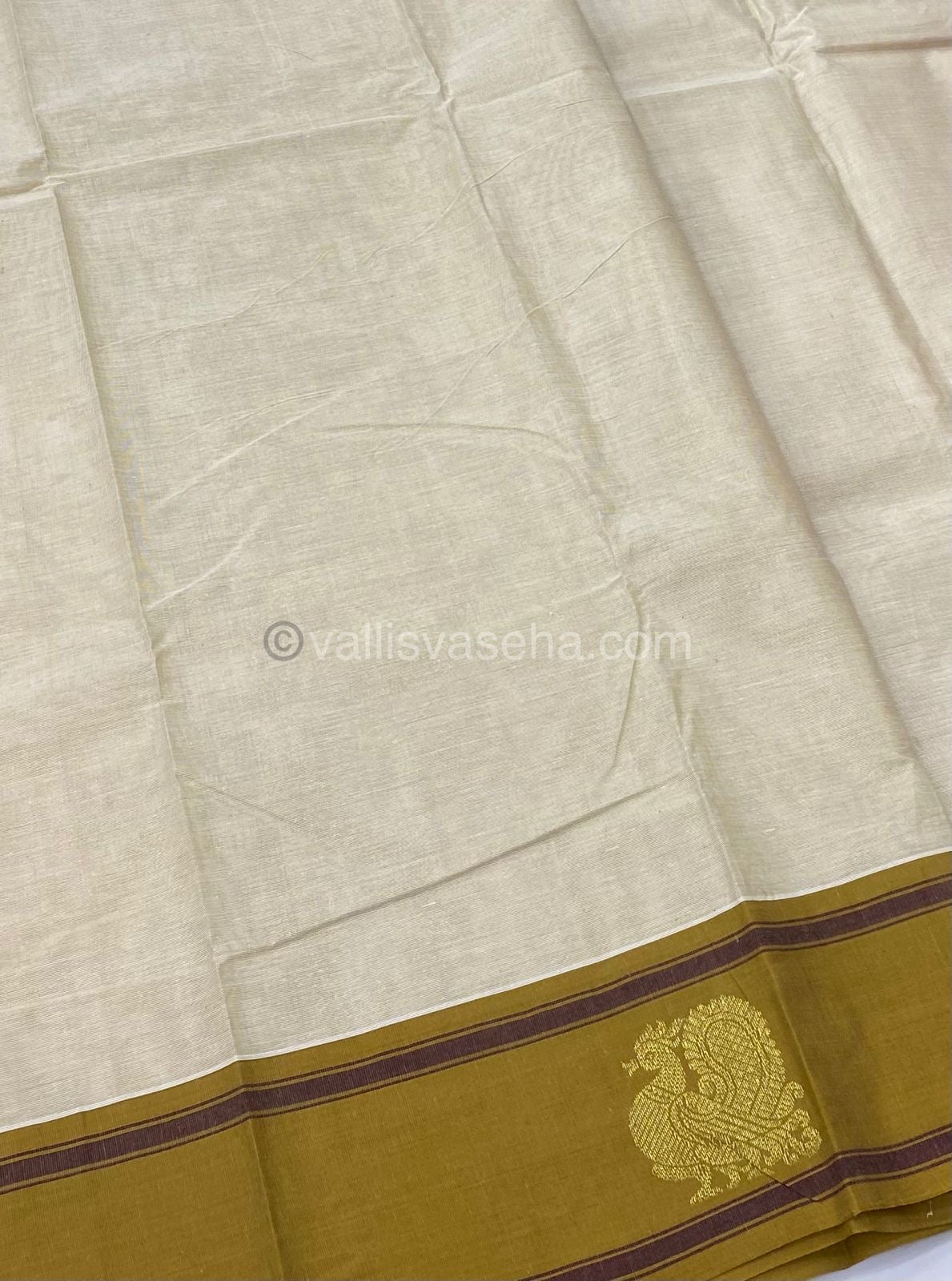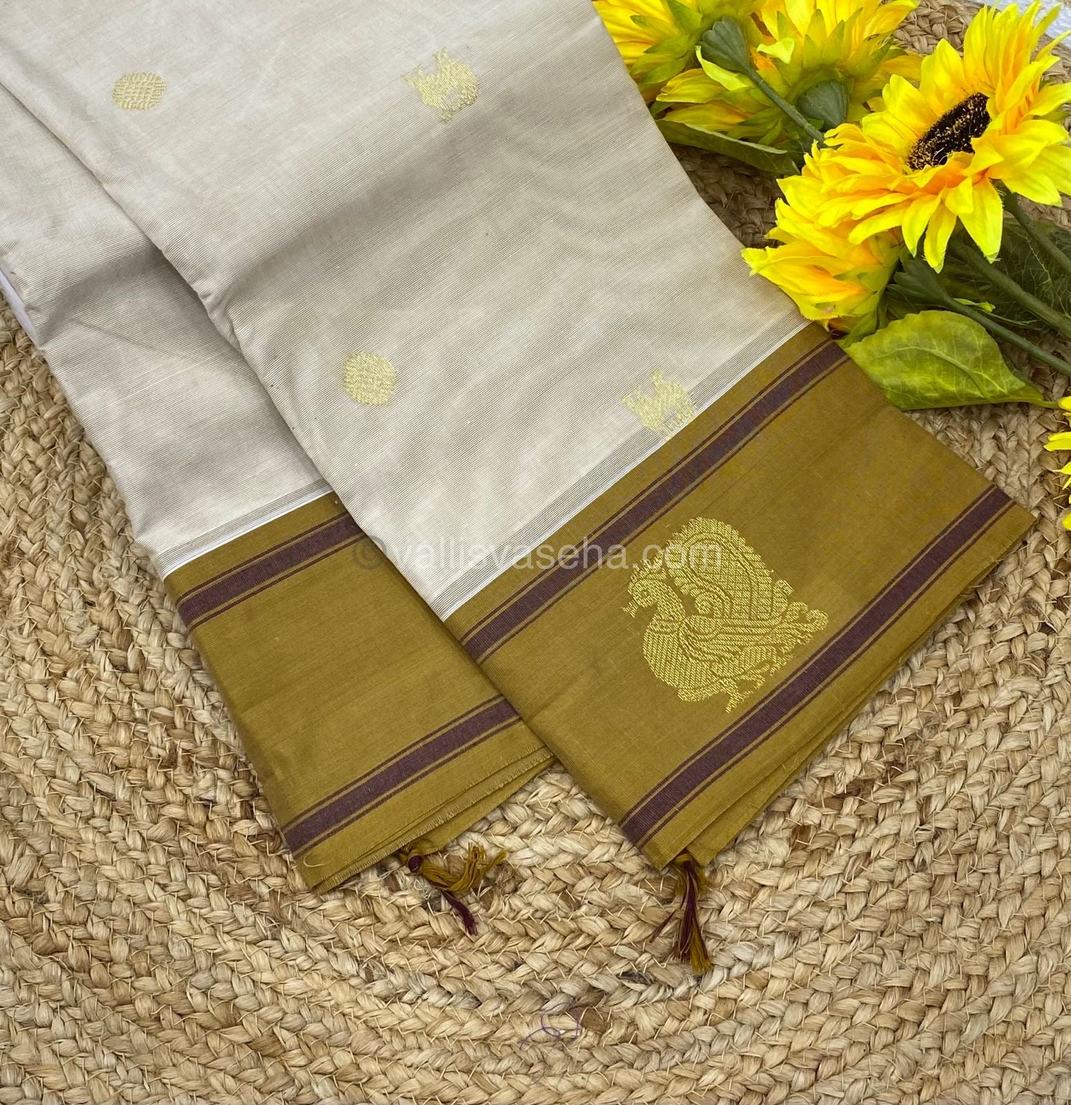 Pure Handloom Kanchi Cotton Sarees 100 counts with all over chakkaram and yazhi design zari butta with Peacock butta in retta petta Border. Running Blouse and Grand zari woven Pallu.