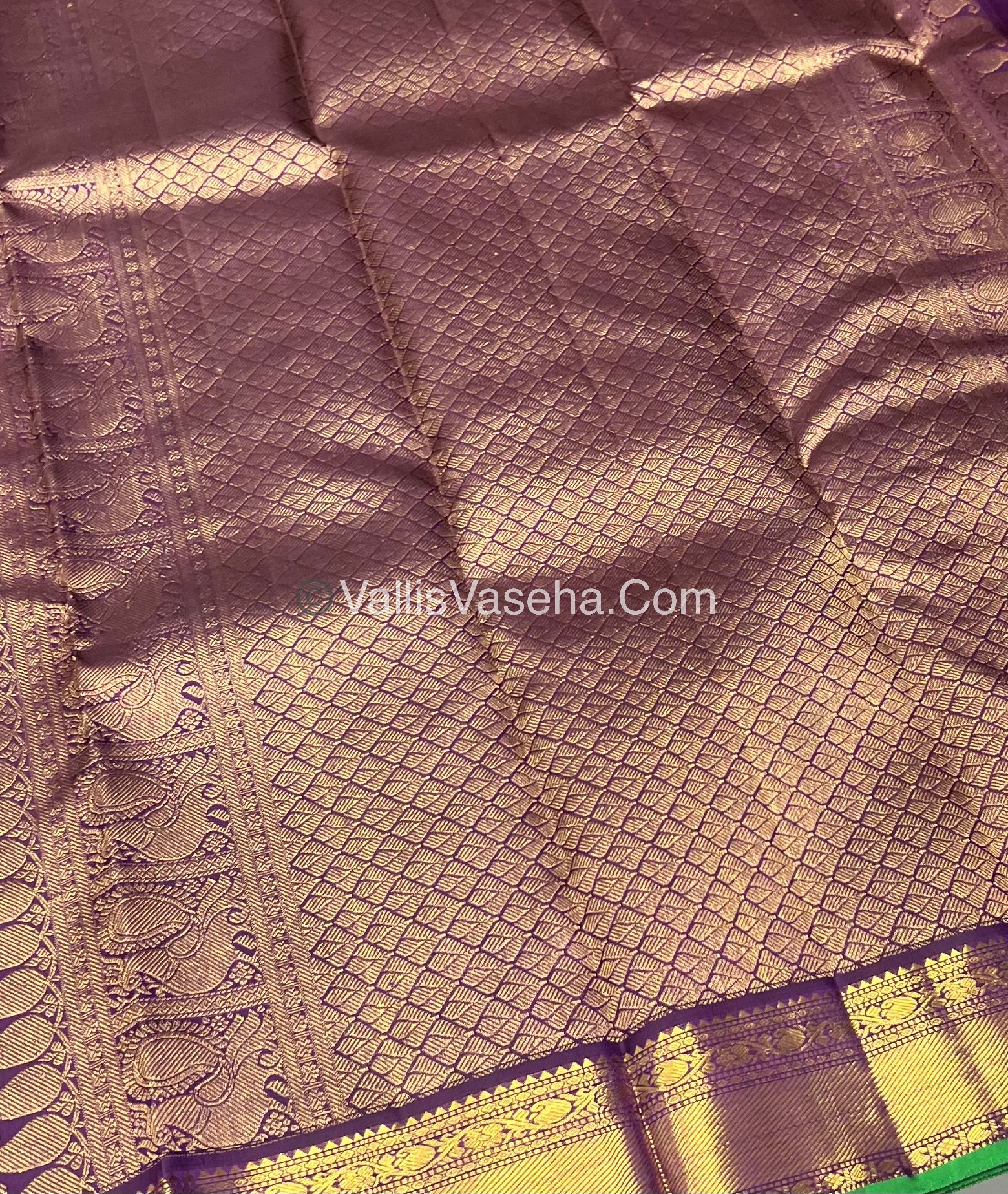 Pure Kanchipuram Silk Saree. Trendy Color combo Saree - All over Mayil & Chakkaram Butta - contrast Rich Ganga Jamuna Style border With Contrast Pallu & Contrast Blouse .