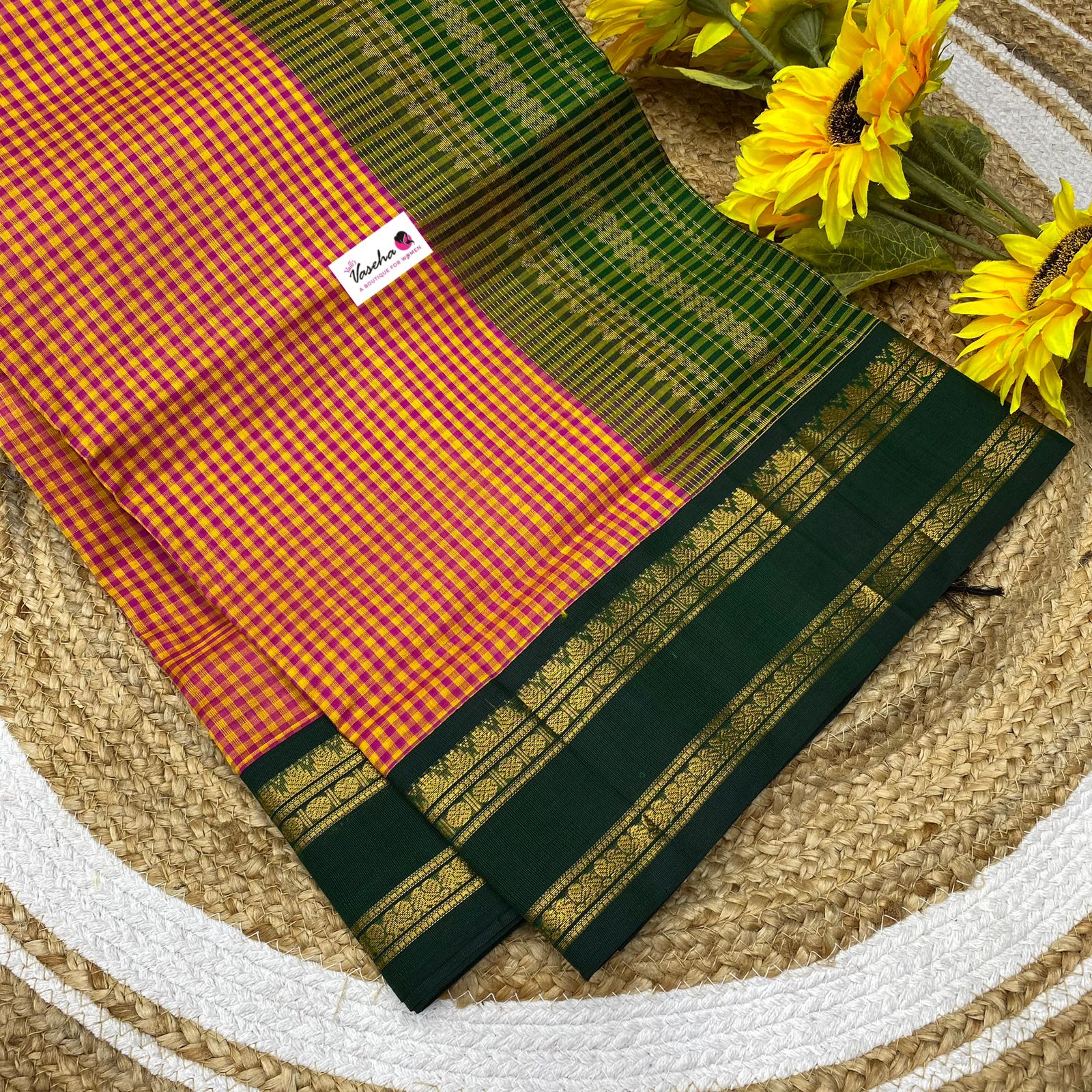 Pure Korvai Silk Cotton - Podi Kattam - Yellow & Pink with Green Retta Petta Border - VVKSC003