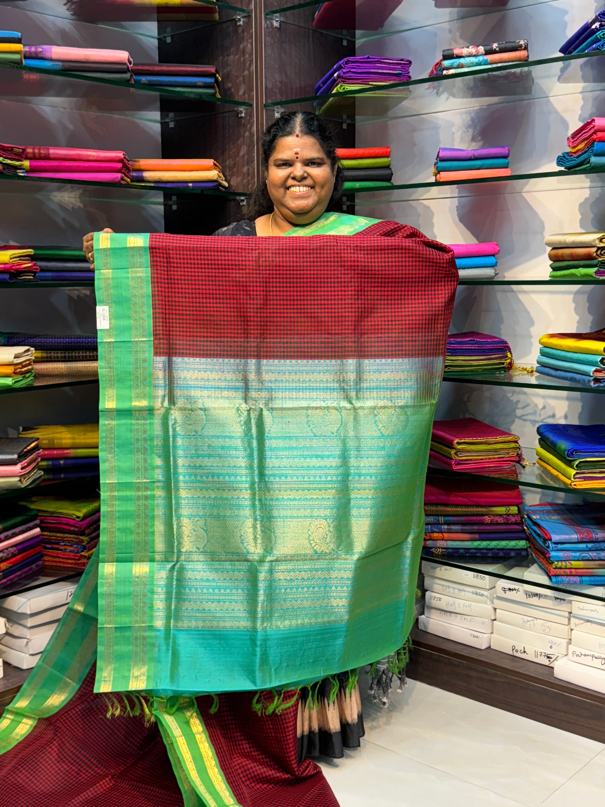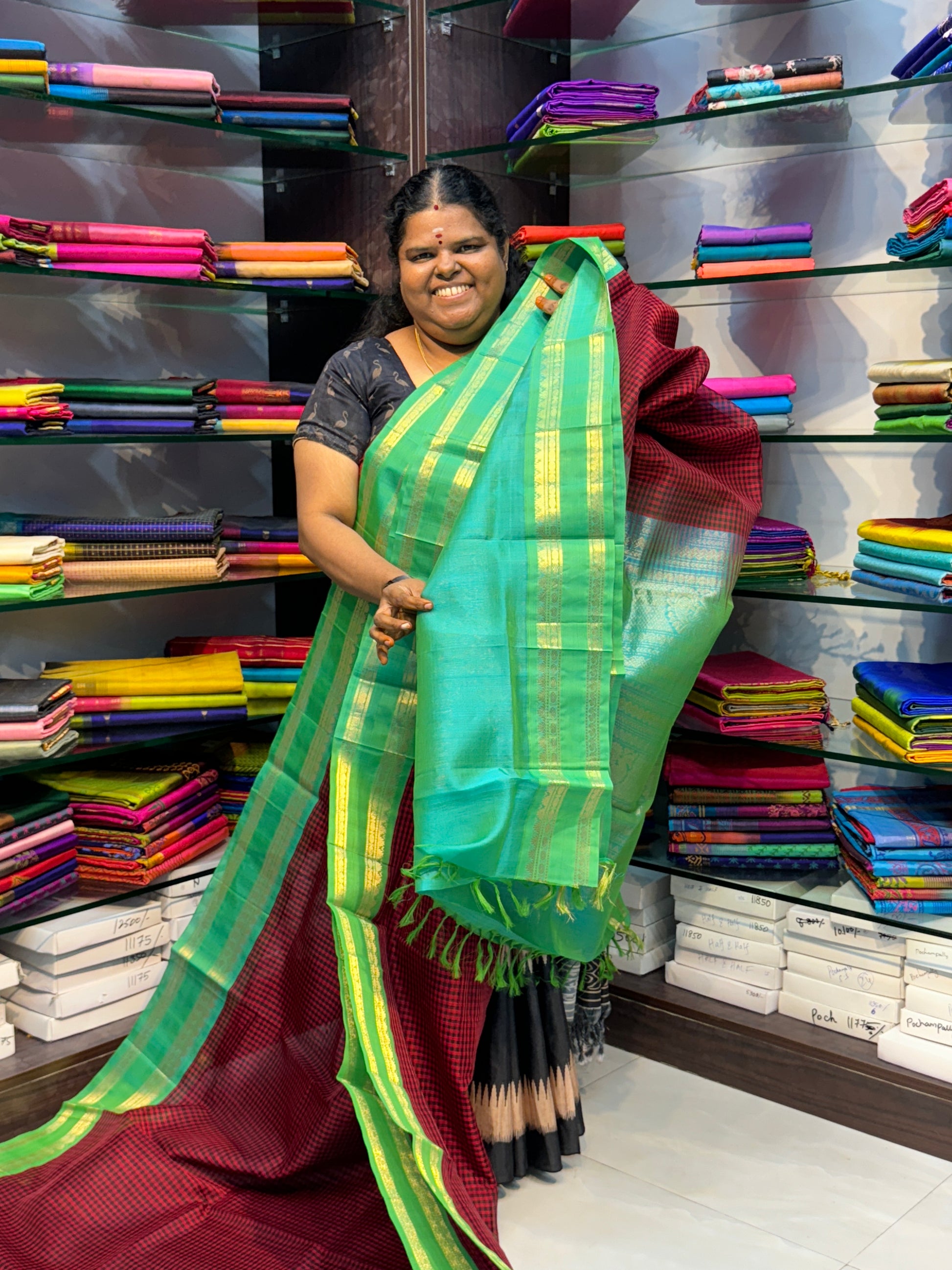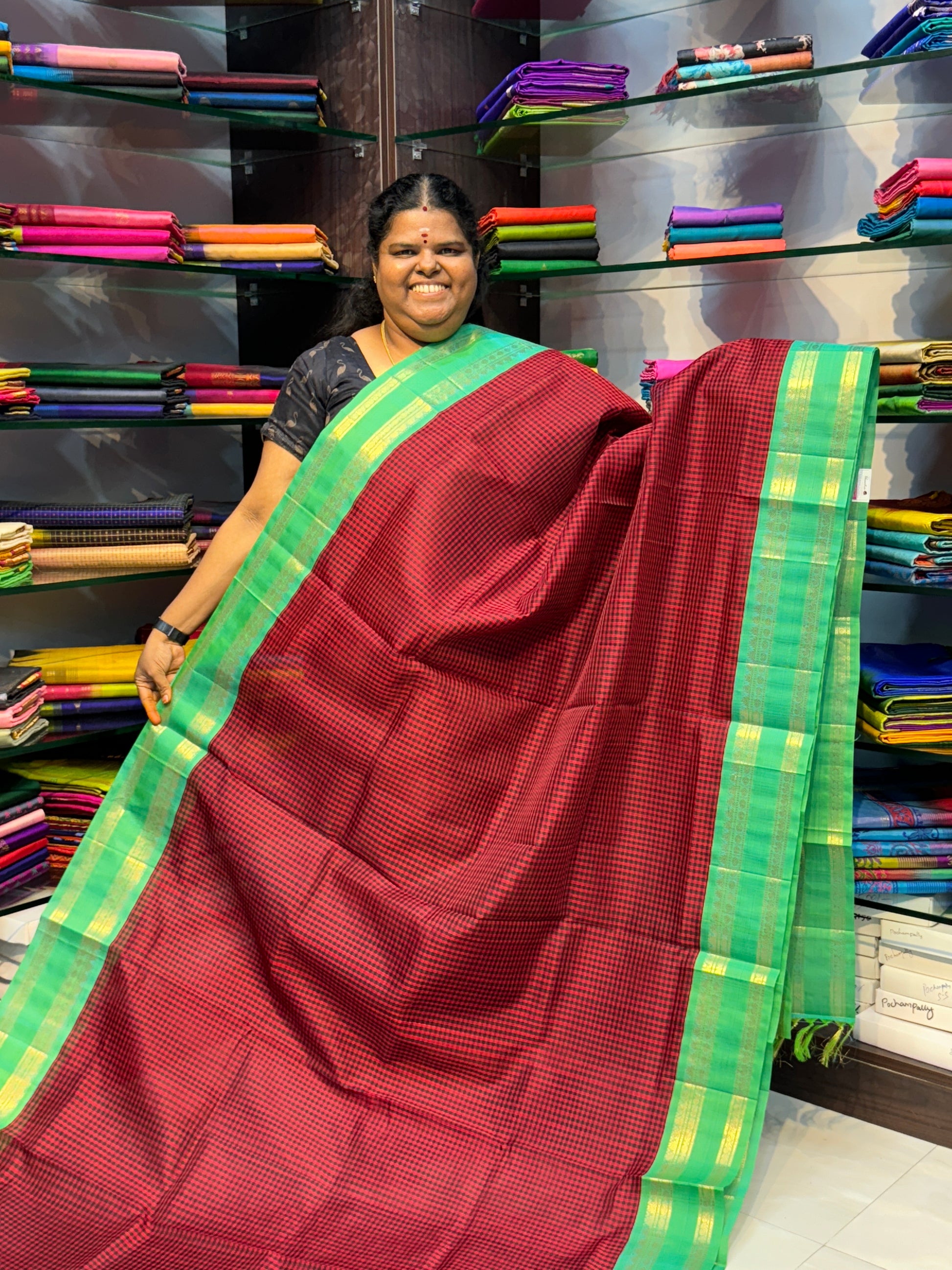 Pure Korvai Silk cotton sarees with Retta Petta border with 60% silk thread and 40% cotton thread … all over Podi kattam ( small checks in black and Merun combo )