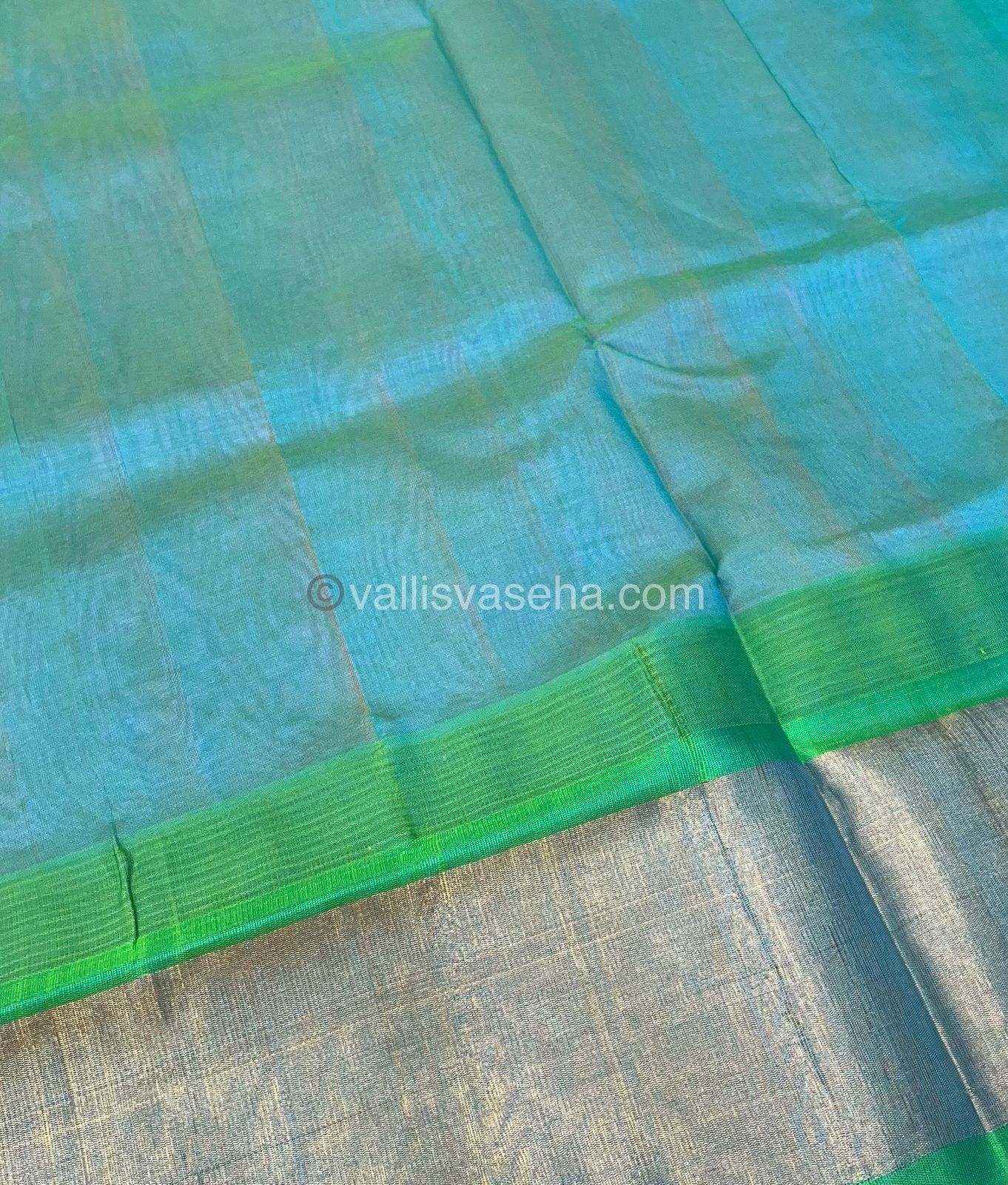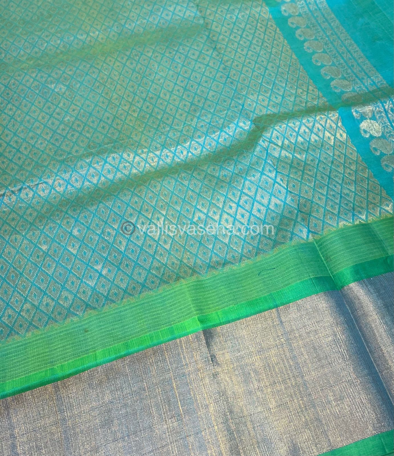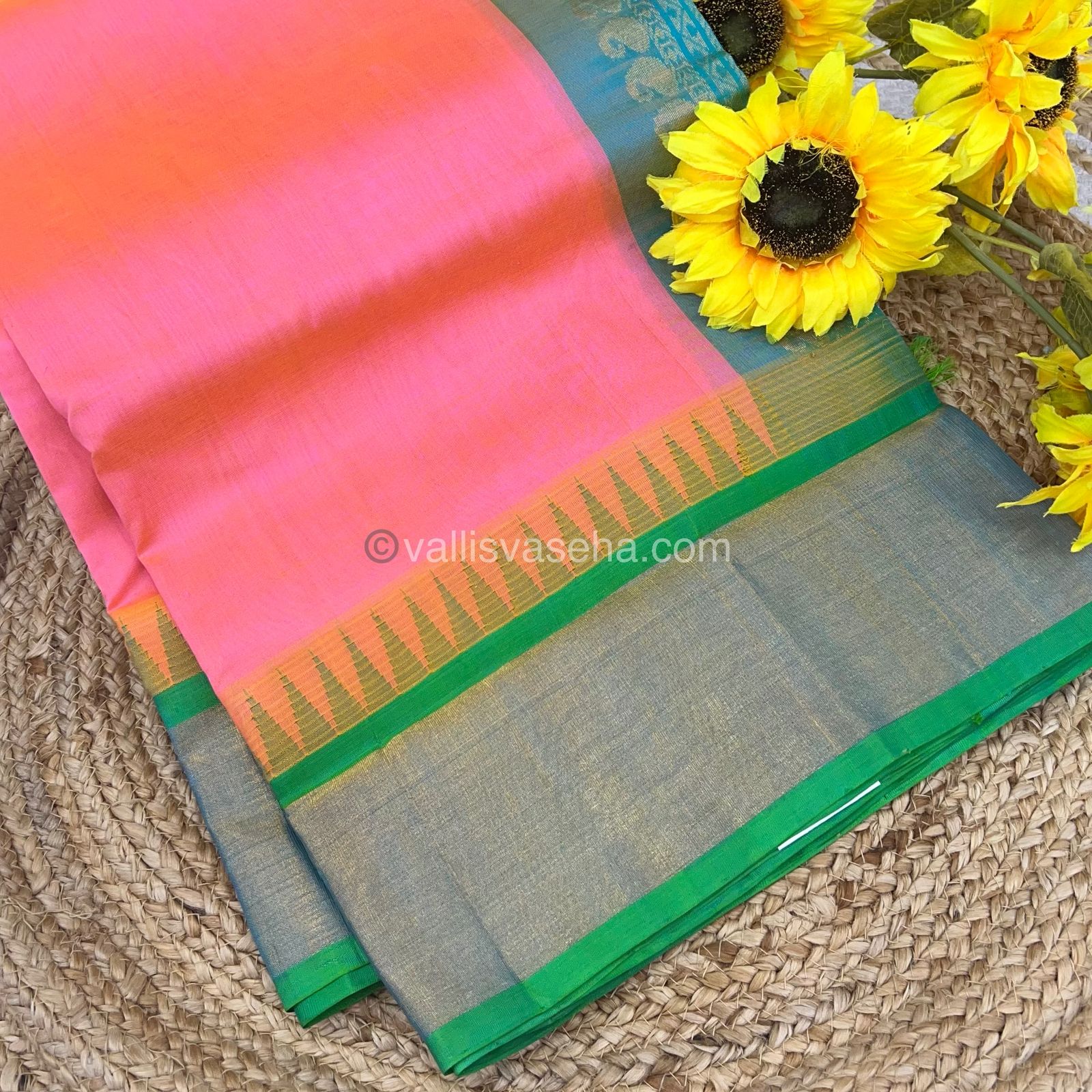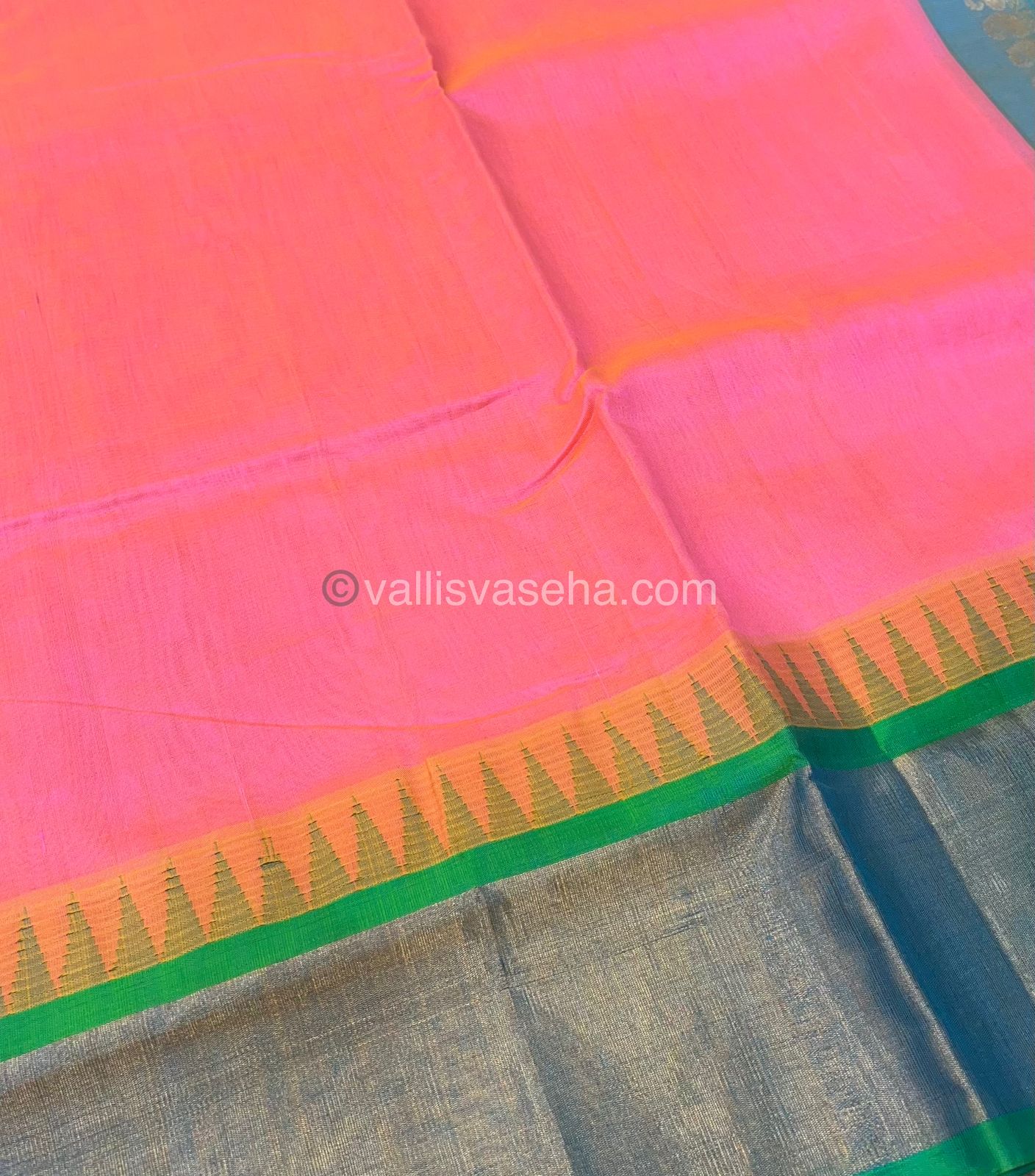 Pure Korvai Silk Cotton Saree - Pink With Blue Shade Temple border - VVKSC001
