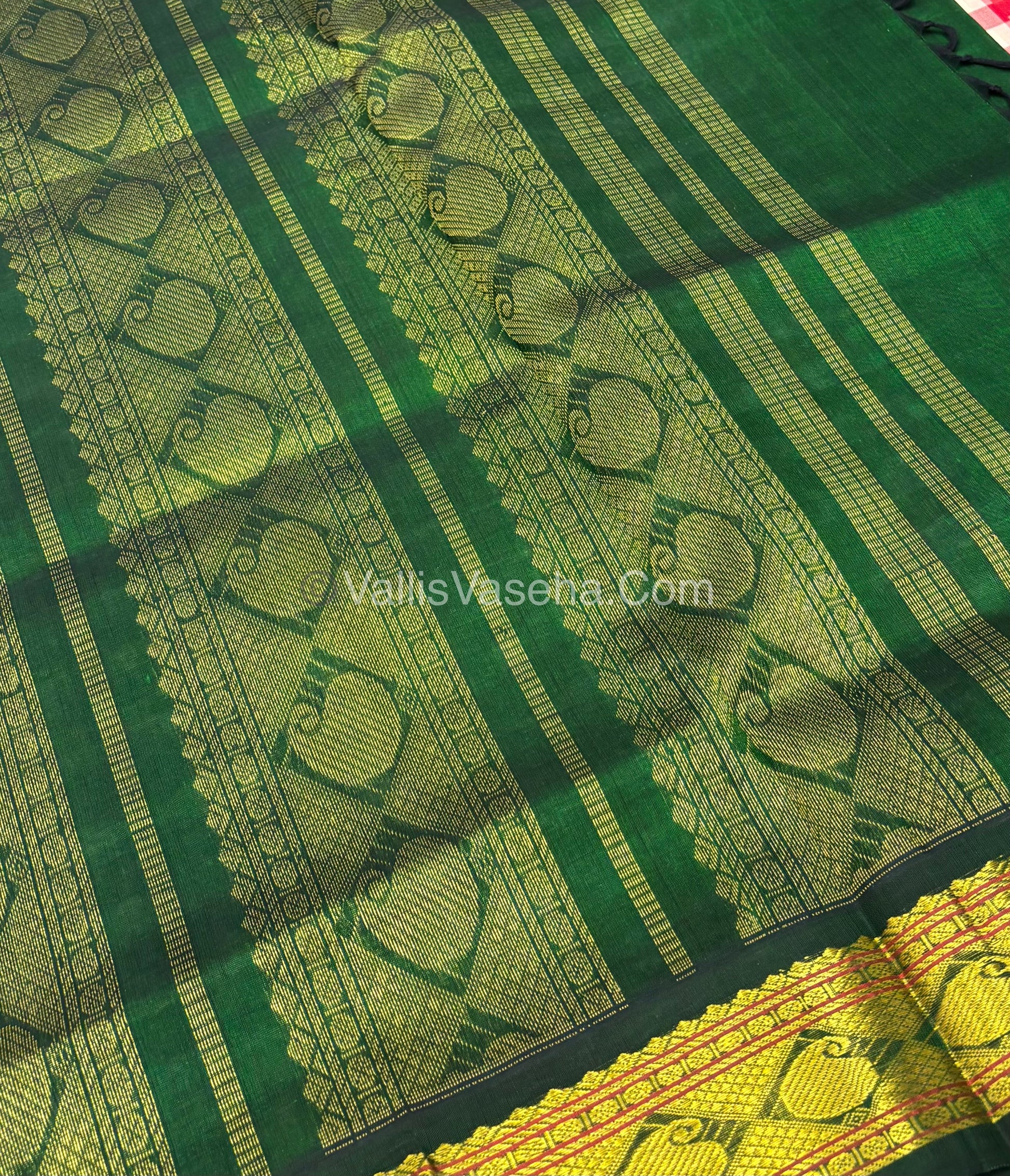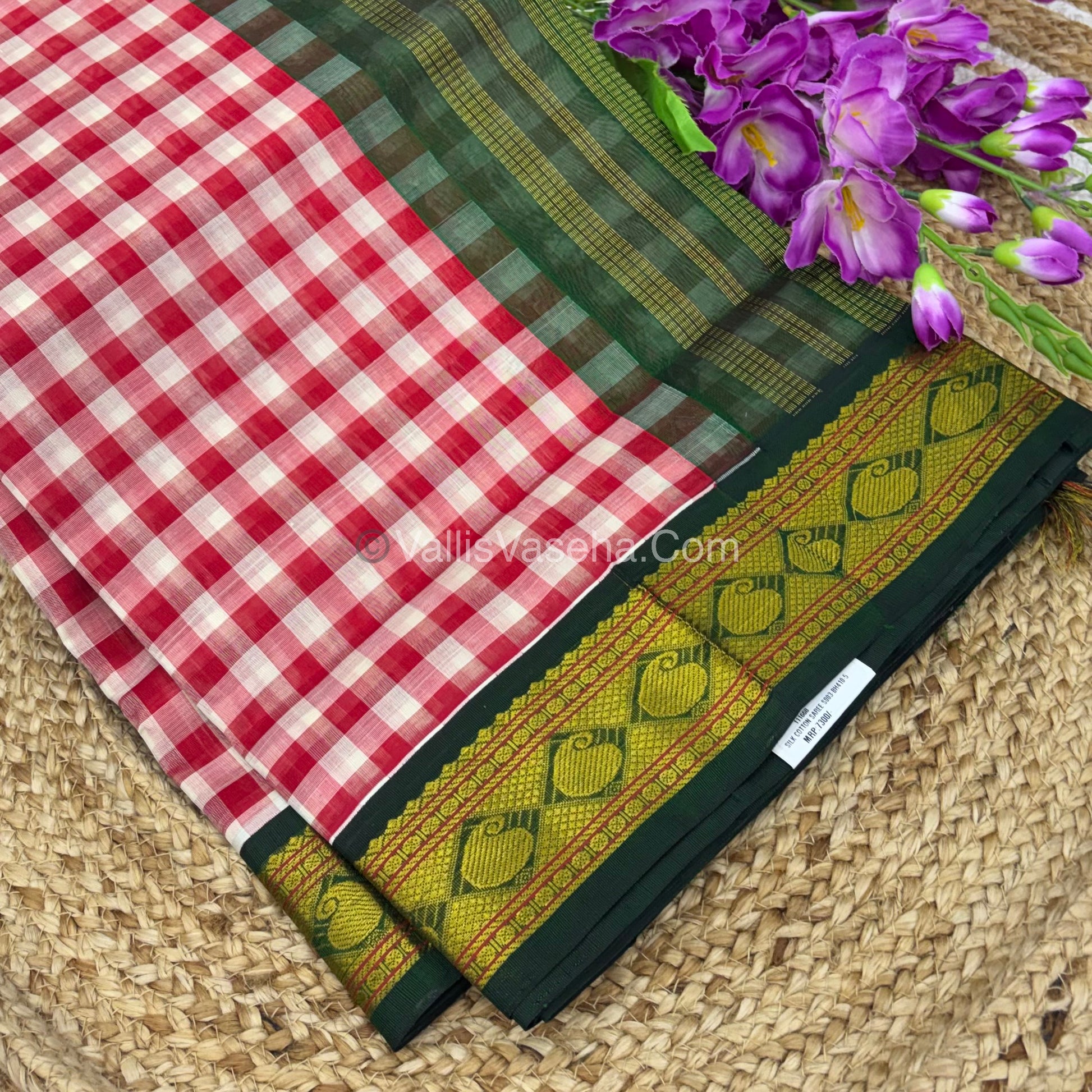 Pure Korvai Silk Cotton With Retta Petta Border - White & Red kattam pattern with Green - VVKSC003
