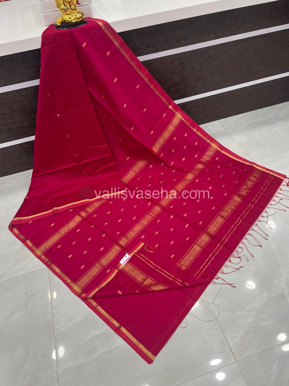 Pure Maheshwari Silk cotton sarees - Light weight Saree , Butta design all over the body with 60% silk thread and 40% cotton thread.Thin strip of border , Grand Pallu and Running Blouse . Slightly transparent but when we pleat it will be good.