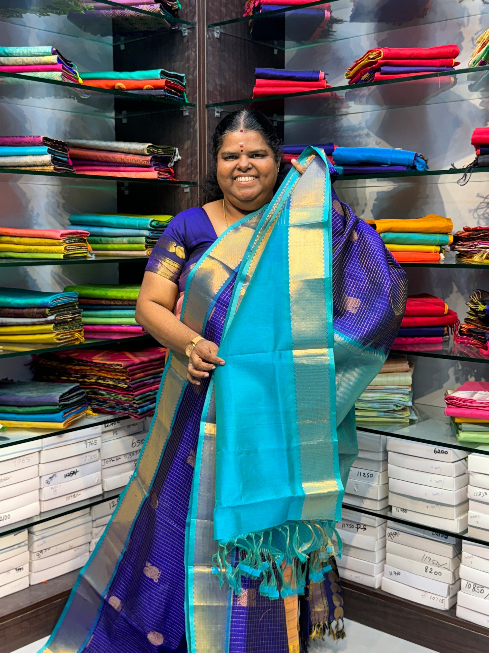 Pure Silk cotton sarees - 60% silk thread and 40% cotton thread. All over zari checks and Mayil & Chakkaram butta with Thick pavanji Border . Contrast Grand Pallu and Contrast Blouse .