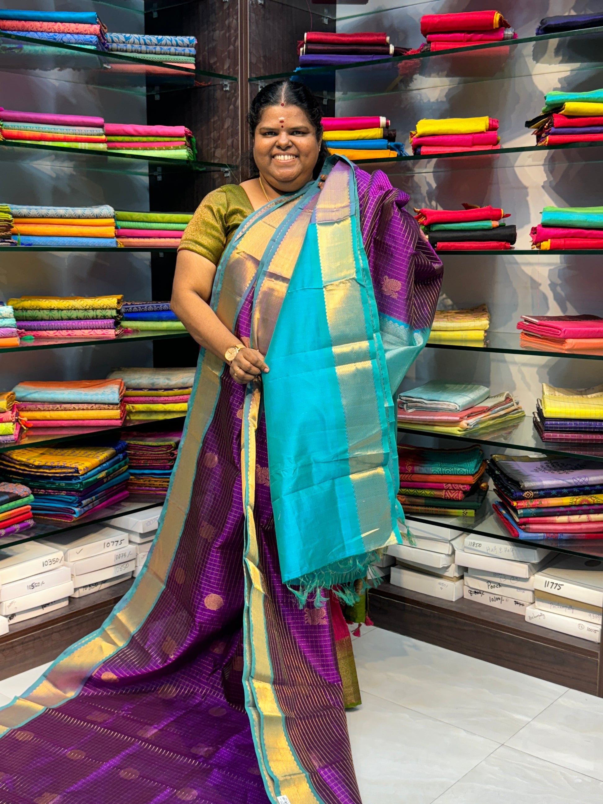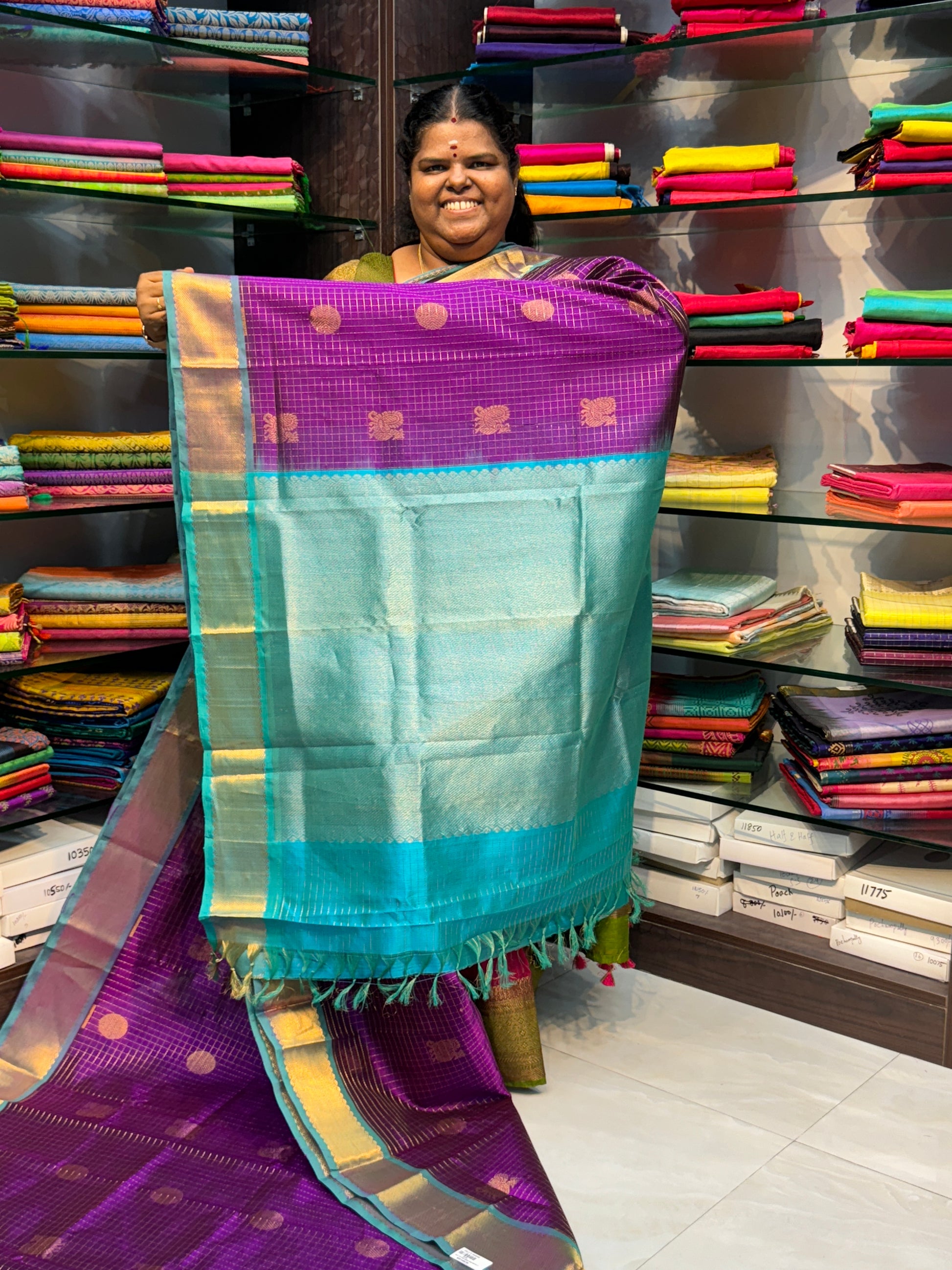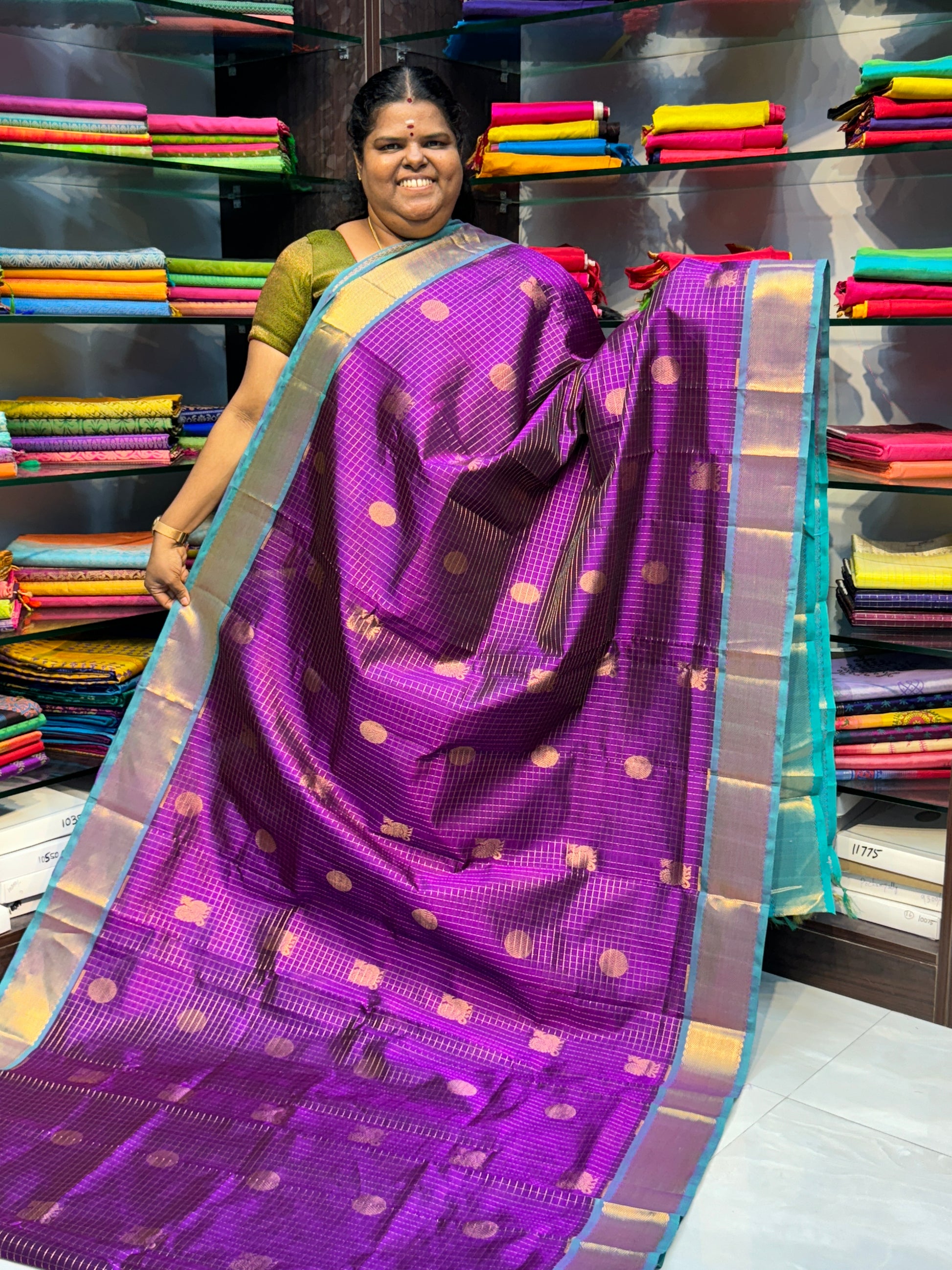 Pure Silk cotton sarees - 60% silk thread and 40% cotton thread. All over zari checks and Mayil & Chakkaram butta with Thick pavanji Border . Contrast Grand Pallu and Contrast Blouse .