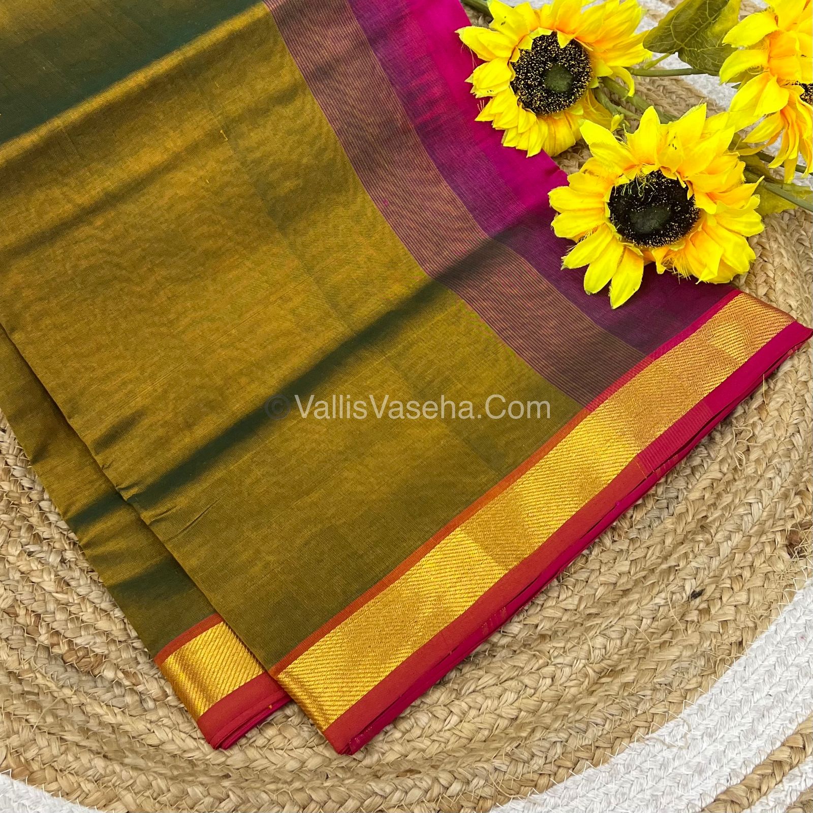 Pure Silk Cotton Sarees -Mehendi Green With Pink - VVPSC003