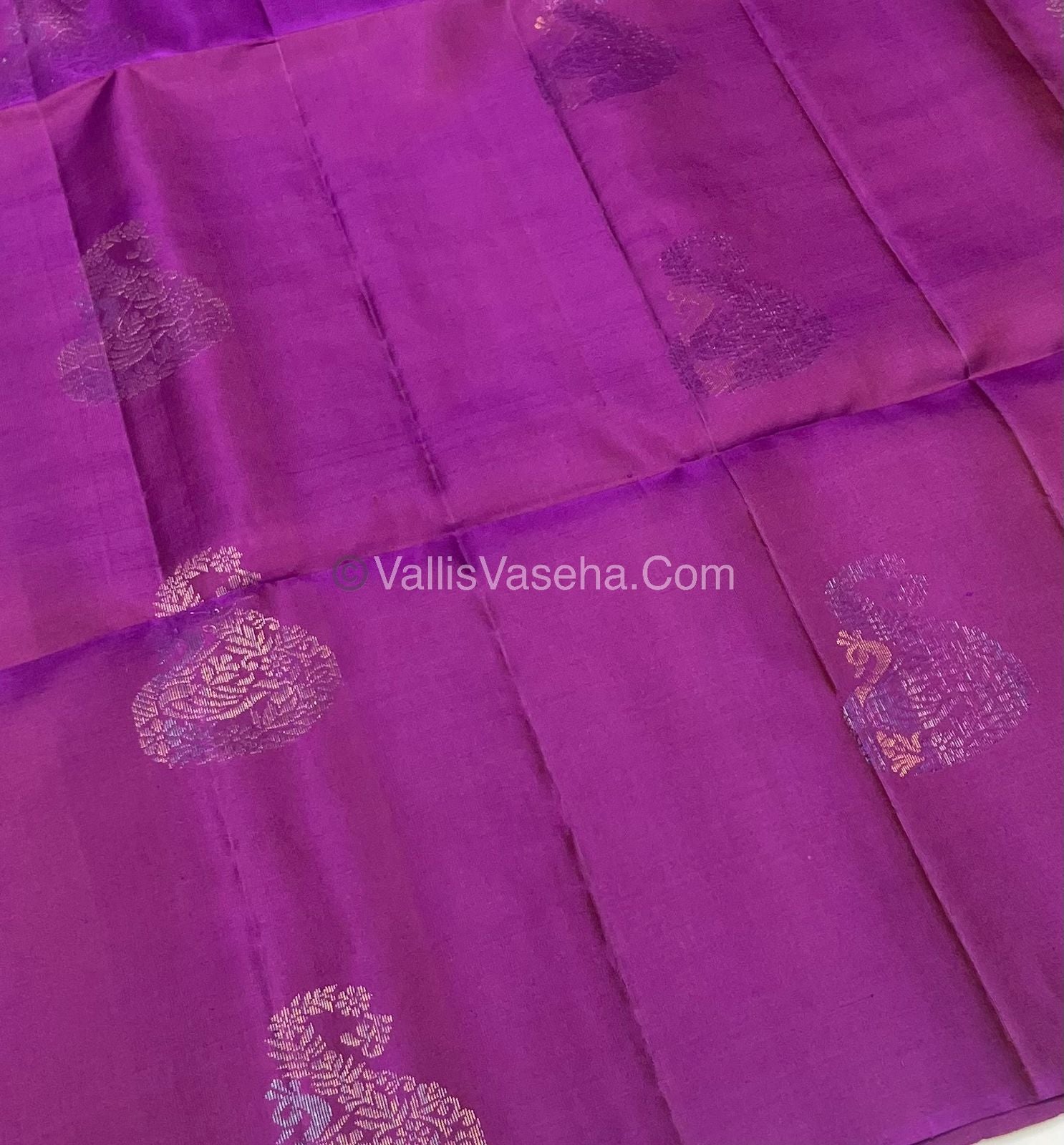 Pure Soft Silk Saree.Double warp with soft finish,border less soft silk , All over mayil Zari butta , contrast rich pallu and contrast blouse.