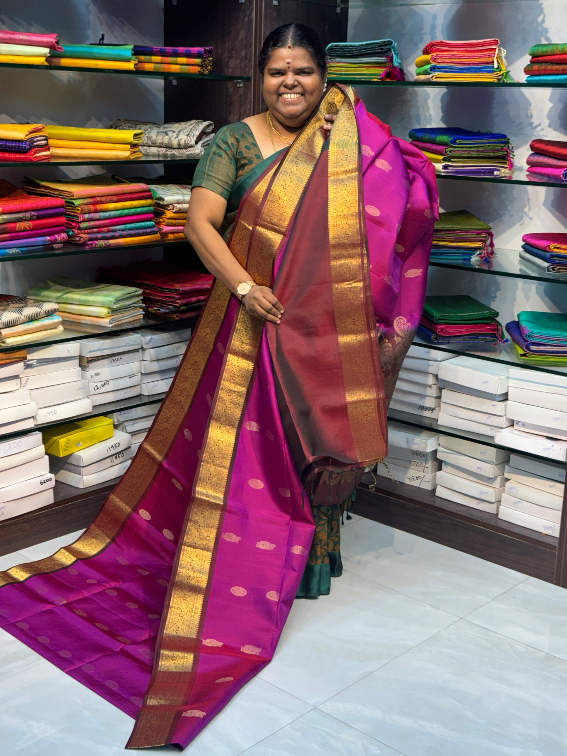 Pure Soft Silk Saree. Double warp with soft finish , light weight saree, All over butta, contrast kanchi border.Contrast Rich Pallu and Contrast Blouse.